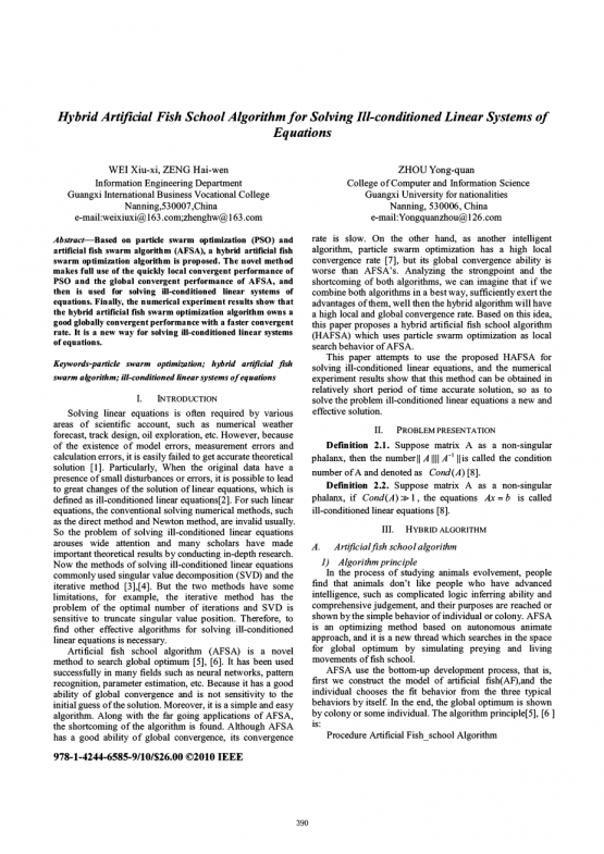 关键词 - 粒子群优化; 杂交人造鱼群算法; 病态线性方程组运算法则。