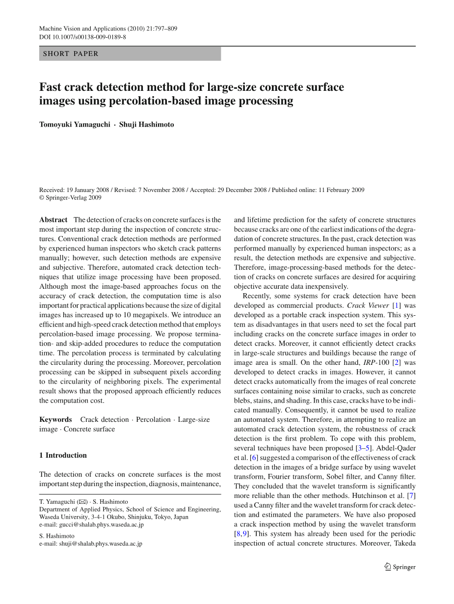 最近,一些用于裂纹检测的系统被开发为商业产品。裂片查看器[1]是一种便携式裂纹检查制度。该系统的缺点是用户需要设置焦点部分,包括混凝土表面图像上的裂缝,以检测裂缝。 此外,由于图像面积范围小,无法有效地检测大型结构和建筑物的裂缝。另一方面,IRP-100[2]被开发用于检测图像中的裂纹。 但是,它不能探测到裂缝从真实混凝土表面的图像中,包含类似于裂缝的噪音,如混凝土瑕疵、污渍和阴影。在这种情况下,裂缝必须手动指示。因此它不能用来实现自动化系统。 因此,在试图实现自动化裂纹检测系统时,裂纹检测的准确性是第一个问题。 为了应付这个问题,已经提出了几种技术[3-5]。Abdel-Qader等人[6]提出了利用小波变换对桥面图像中裂纹检测的有效性进行比较,傅里叶变换、Sobel滤波器和Canny滤波器。 他们得出结论,小波变换比其他方法更可靠。哈钦森等人[7]采用Canny滤波器和小波变换进行裂纹检测,并对参数进行了估计。我们还提出了一种利用小波变换[8,9]进行裂纹检测的方法。该系统已用于实际混凝土结构的定期检查。此外,Takeda等人[10]还提出了一种基于小波变换的实用裂纹检测系统。然而,这些方法没有考虑裂纹的本质特征,如它们的连通性。因此,当图像包括噪声时,不能准确地检测裂纹 另一方面,Iyer等人[11]使用数学形态学和Miwa等人[12]采用分水岭分割。他们把重点放在线性度作为裂纹特征;然而,这些方法不能高精度地检测裂纹,因为检测到的线是近似裂纹,而精度是图像中准确测量裂纹宽度的重要因素。罗利[13]和Hatada等人[14]认为裂缝的方向是局部窗户的一个特征,然后试图检测花岗岩板和排水沟上的裂缝。Fujita等人[15]提出了两种采用减法和Hessian矩阵的预处理方法。由于局部窗口是固定的,这些方法不能灵活地应用于不同的方法租金宽度。