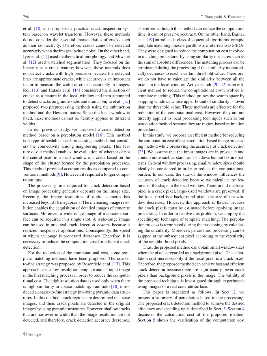 为了降低计算成本,提出了一些模板匹配方法。 罗森菲尔德等人提出了粗细策略 [17]。 这种方法使用低分辨率模板和输入图像在第一次匹配过程中,以降低计算成本。只有在粗匹配中存在较高相似性时才使用高分辨率数据。 Tanimoto[18]引入了涉及金字塔数据结构的粗到细策略。 在该方法中,在粗图像中确定裂纹区域,然后通过使用金字塔结构。 然而,宽度比图像分辨率窄的浅裂纹没有被检测到,因此裂纹检测精度降低。 因此,虽然这种方法可以减少计算时间,但不能保持精度。 另一方面,Barnea等人[19]介绍了一类快速模板匹配的顺序算法;这些算法被称为SSDA。 它们的设计是为了通过使用绝对差异之和等相似性度量来降低匹配过程中所涉及的计算成本。 如果相似度单调递减,达到一定的阈值,则在处理过程中可以终止匹配过程。 因此,我们不必计算局部窗口中所有像素之间的相似性。主动搜索[20-22]是一种有效的方法,可以降低模板匹配所涉及的计算成本。 该方法通过跳过相似度上界低于阈值的窗口来修剪搜索空间。 这些方法有效地降低了计算成本。 然而,它们并不直接应用于局部处理技术,如我们的渗流方法,因为它们是基于区域的估计过程。
