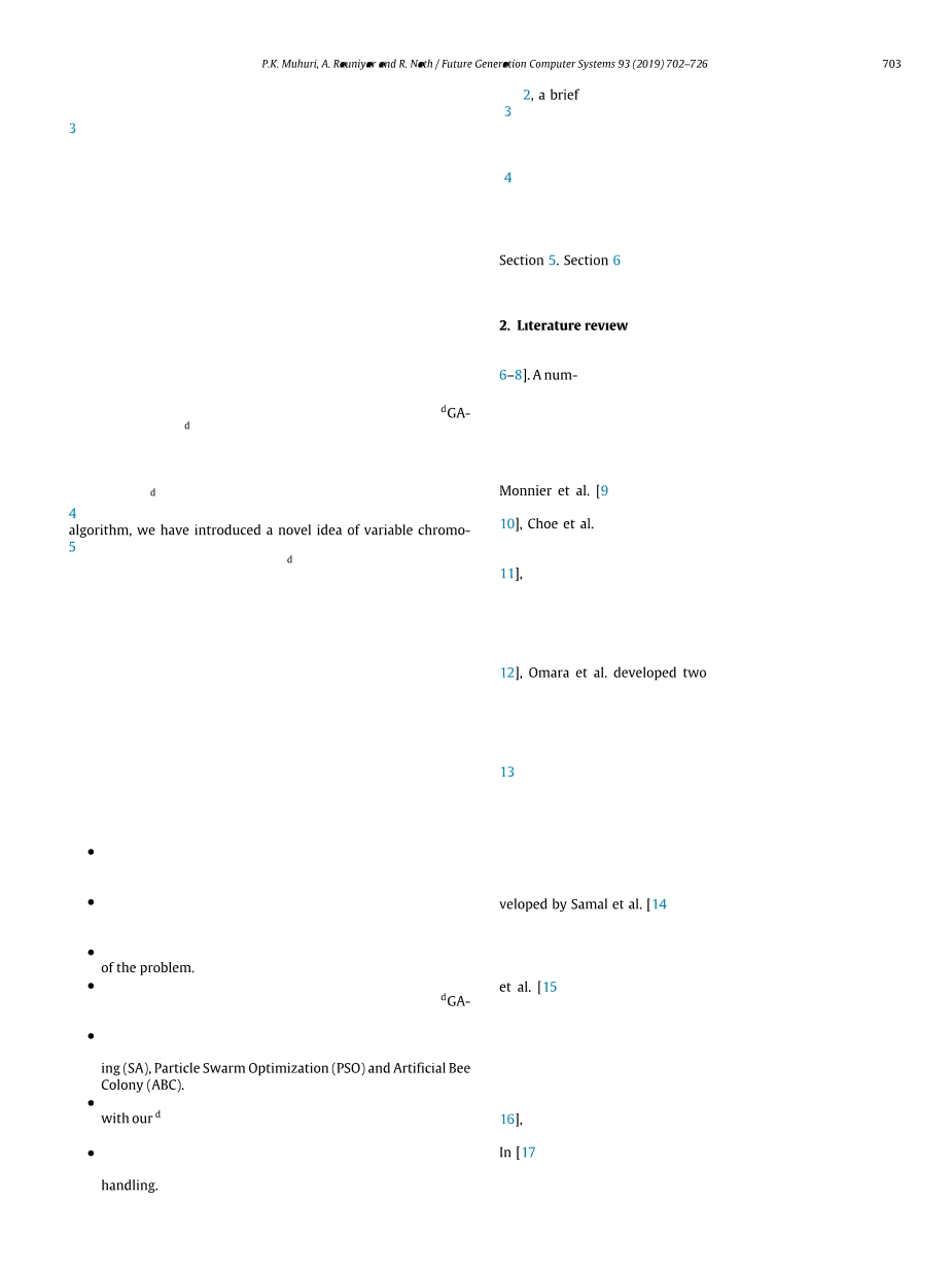 在其早期应用于调度问题之一,Monnier等人。[9]实现了一个GA来解决复杂的实时周期性任务调度问题,以便在分布式环境中获得最优的调度。在[10]中,Choe等人提出了一种基于GA的迭代重新调度方法来提升实时约束下的性能,据报道这种方法的表现优于基于模拟退火的方法。在[11]中,Oh等人提出了一种基于GA的解决方案技术,用于在多处理器系统上查找任务执行的最佳调度,旨在最大限度地减少所需的处理器数量任务的迟到。几种杂交形式的GA也是开发用于改进多处理器任务调度的形成时间表。在[12]中,Omara等人发展了两个混合GAs,。即CPGA(关键路径遗传算法)和TDGA(任务复制遗传算法)用于通用计算系统中的任务调度问题。 CPGA可以最小化执行长度并平衡负载,而TDGA使用了任务复制的想法,以优化通信开销任务之间。最近,Zhang等人 [13]设计了基于GA的负载感知资源分配和DAG的解决方案技术云计算系统的任务调度(LA-RATS)策略。他们的实验结果表明该方法已经完成以及最小化货币成本,总周转时间和提高延迟容忍和敏感的最后期限满意度应用。一种用于容错调度的新型混合遗传算法保证Samal等人开发了实时任务截止日期的合规性 [14]。他们设计了一个调度程序模型和主要备份容错方法,考虑任务的实时属性来处理故障。这种方法实现了解决方案经过几个任务集的实验证明了他们的技术能够产生改进的解决方案。阿克巴里等。 [15]提出了一种基于GA的新技术遗传算子的调整和初始种群的调整以进行优化计划长度较低的重复解决方案。它们在异构系统中的随机图上进行了模拟并测量了几个性能指标。他们的结果的比较研究表明在这方面有显着的提高到其他调度算法。