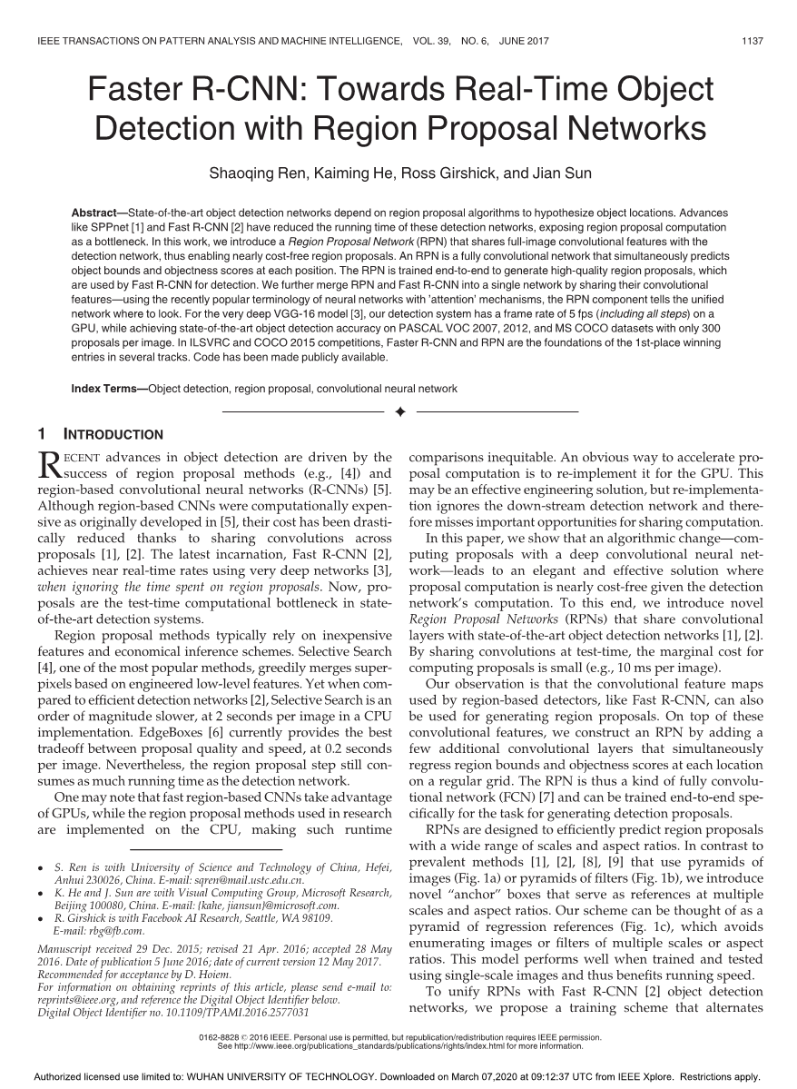 Shaoqing Ren, Kaiming He, Ross Girshick, and Jian Sun