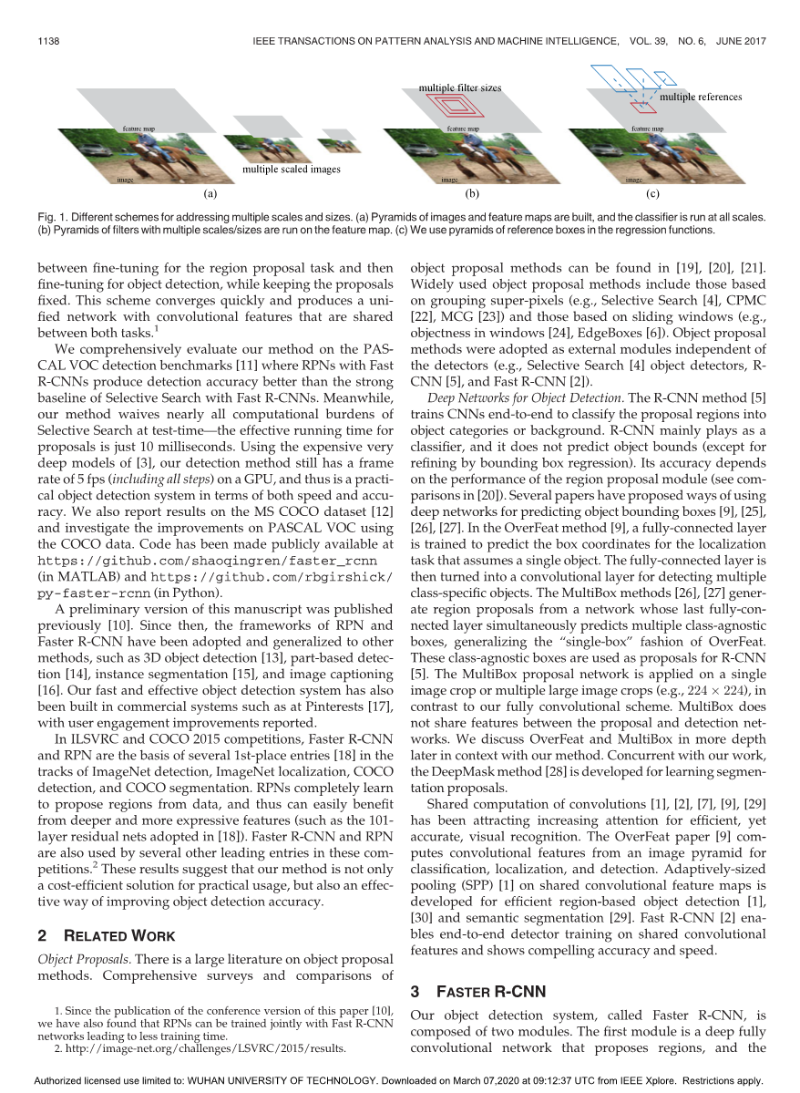 该手稿的初步版本已在之前出版[10]。自那时起,RPN和Faster R-CNN框架就被采用并推广到其他方法,如3D目标检测[13]、基于局部的检测[14]、实体分割[15]和图像字幕显示[16]。我们的快速有效的目标检测系统也已经在诸如Pinterests[17]这样的商业系统中建立,并报告了用户参与度的改进。
