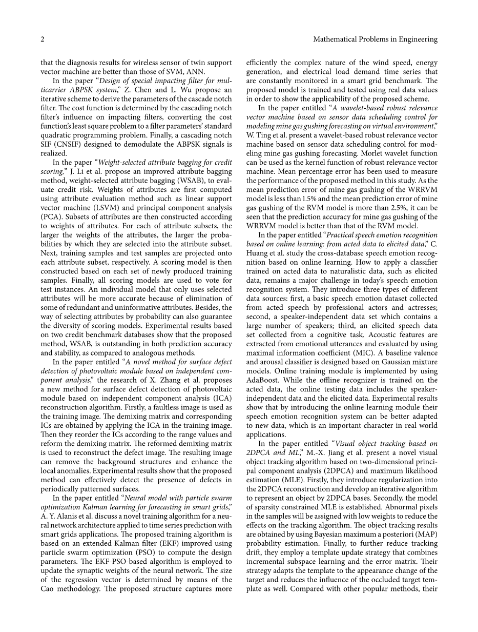 在题目为“双支持向量机在无线传感器故障诊断中的应用”,M.Ding等。为了提高无线传感器的诊断精度,提出了一种基于双支持向量机(TSVM)的无线传感器故障诊断方法。双支持向量机是一种二值分类器,它利用两个非平行超平面代替传统支持向量机中的单超平面进行分类。然而,TSVM训练过程中的参数设置对分类精度有显著影响。他们的研究将PSO作为一种优化技术,同时优化TSVM训练参数。实验结果表明,双支持向量机对无线传感器的诊断效果优于支持向量机、神经网络。