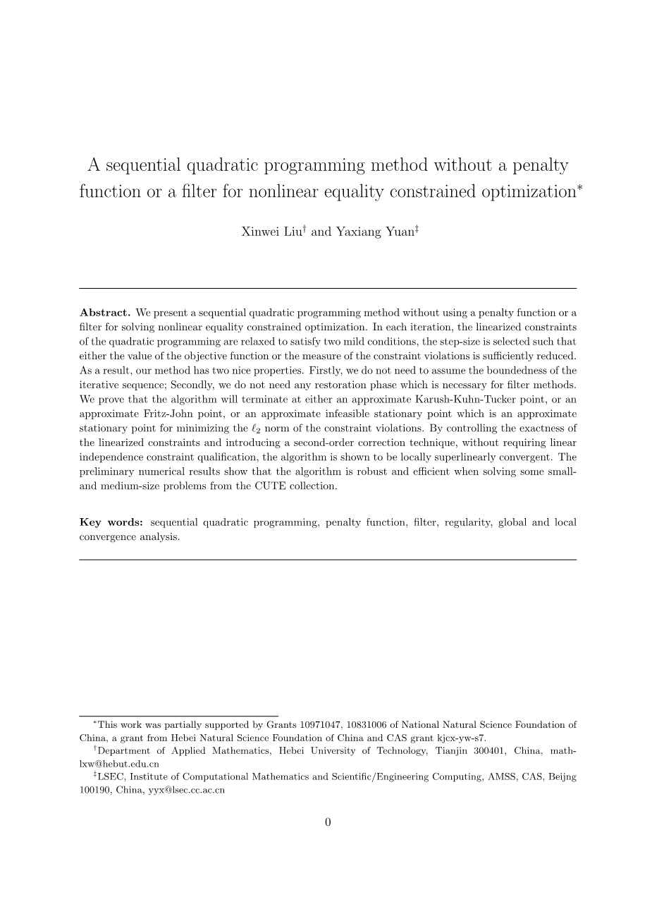 一种无惩罚函数或滤波器的非线性等式约束优化序列二次规划方法[1][2]