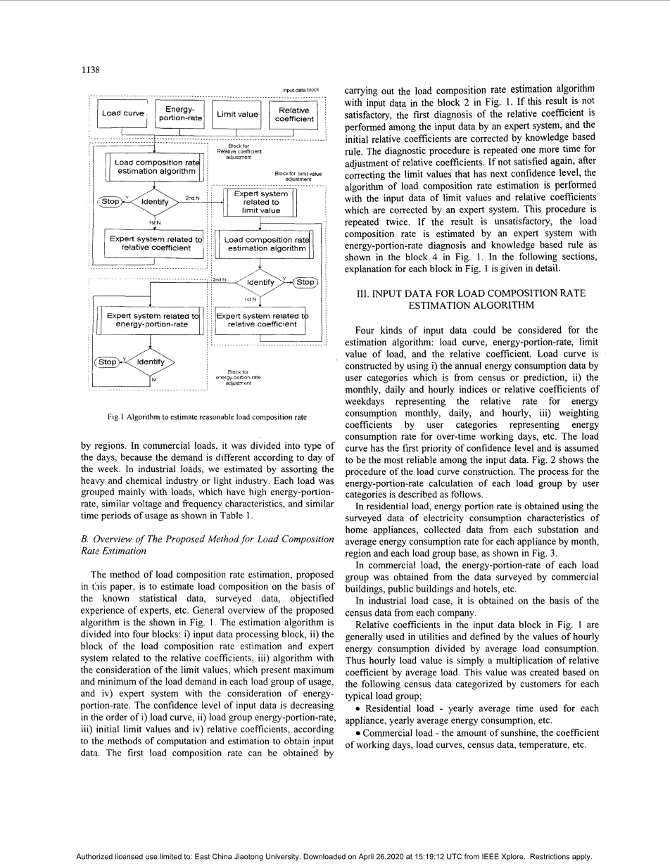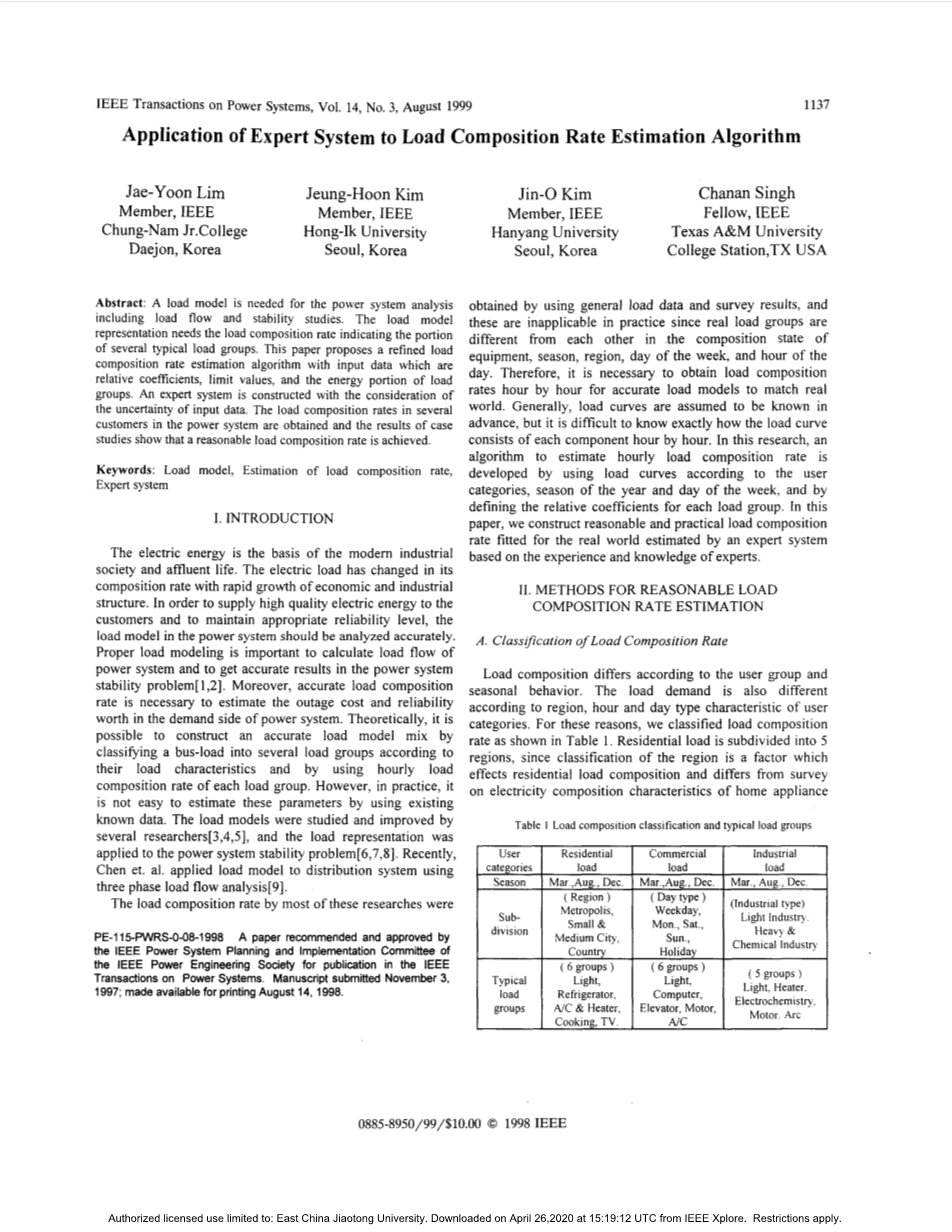 电能是现代工业社会和富裕生活的基础。随着经济和产业结构的快速发展,电力负荷的构成比例发生了变化。为了向用户提供高质量的电能,保持适当的可靠性水平,需要对电力系统负荷模型进行准确的分析。在电力系统稳定问题[1,2]中,正确的负荷建模是计算电力系统潮流和获得准确结果的重要环节,而准确的负荷构成率是估计电力系统需求侧停电成本和可靠性价值的必要条件。从理论上讲,根据负荷特性将一个公交负荷分为若干个负荷组,并利用每个负荷组的小时负荷构成率,可以构造一个准确的负荷模型组合。然而,在实际应用中,利用现有的已知数据估计这些参数并不容易。几个研究人员对负荷模型进行了研究和改进[3,4,5],并将负荷表示应用于电力系统稳定问题[6,7,8]。最近,Chen等人利用三相潮流分析将负荷模型应用于配电系统[9]。