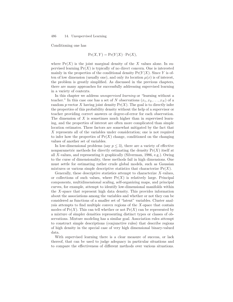 在低维问题(例如ple;3)中,有多种有效的直接估算密度Pr(X)本身的非参数方法所有的X值,并用图形的方式表现出来(如:Silverman,1986年)。 由于维度灾难,这些方法在高维度上并不适用。 我们必须适应估算相当粗略的全局模型,例如混合的高斯模型或各种简单描述性统计量Pr(X)。