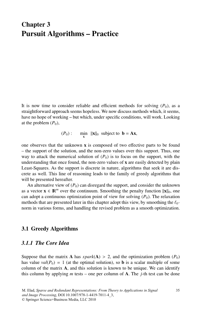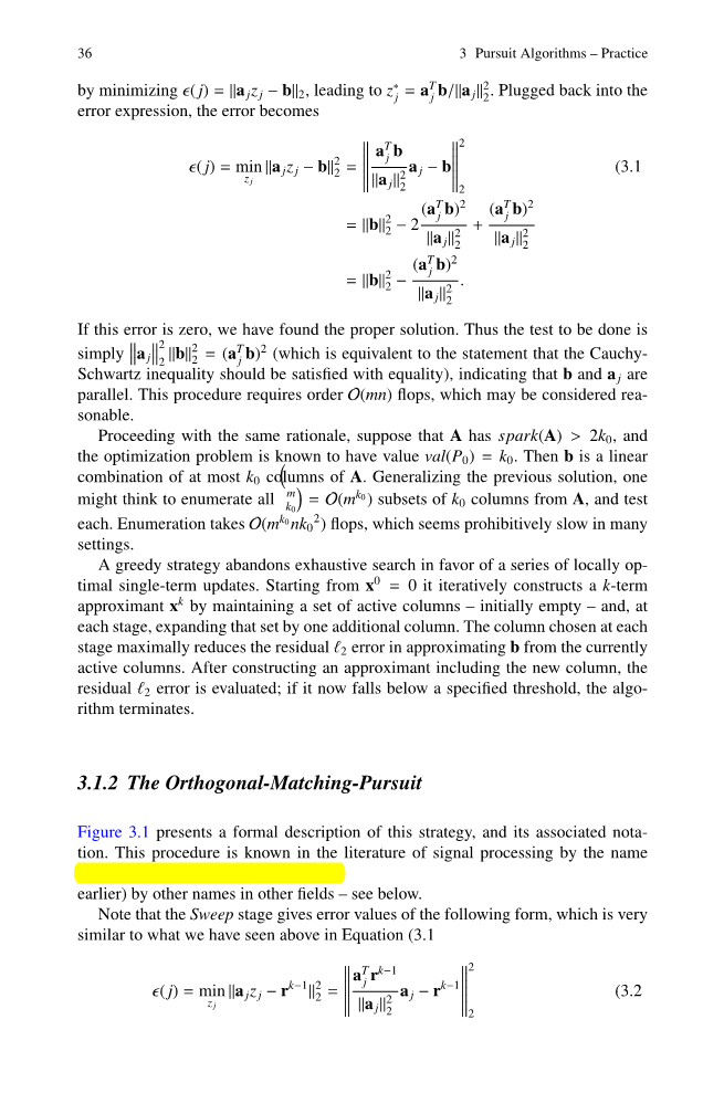 图 3.1 给出了该策略的正式描述及其相关表示法。 这一过程在信号处理的文献中被称为正交匹配-诉讼(OMP),但在其他领域的其他名称中非常著名(而且使用得更早),见下文。