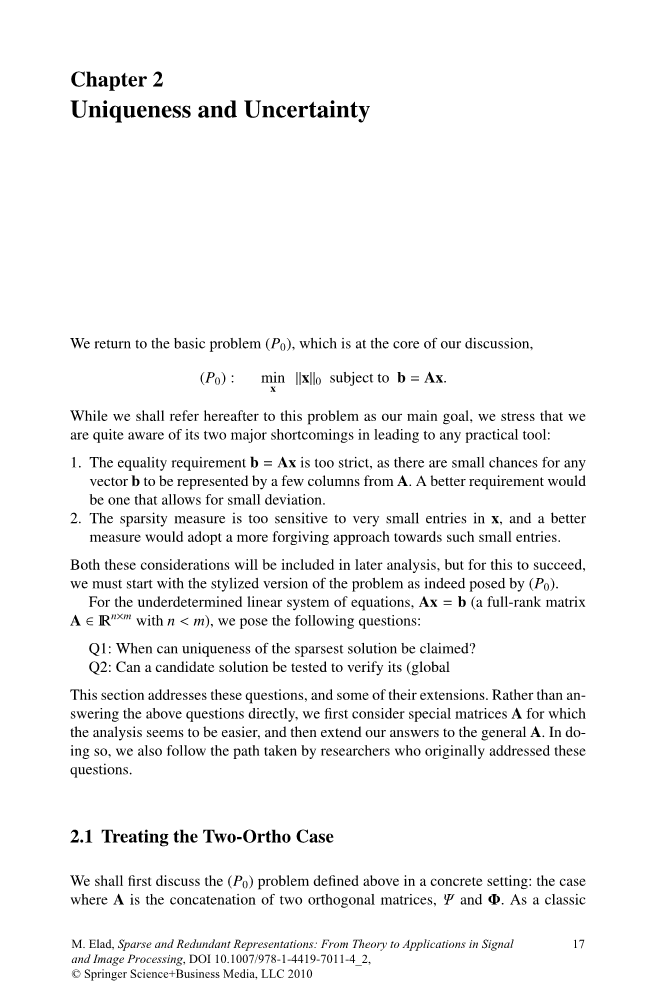 我们回到基本问题(P0),这是我们讨论的核心。(P0):满足b = Ax的x最小0-范数(稀疏度)。虽然我们在下文中会将这个问题作为我们的主要目标,但我们强调,我们很清楚这个问题在任何实际工具方面的两个主要缺点: