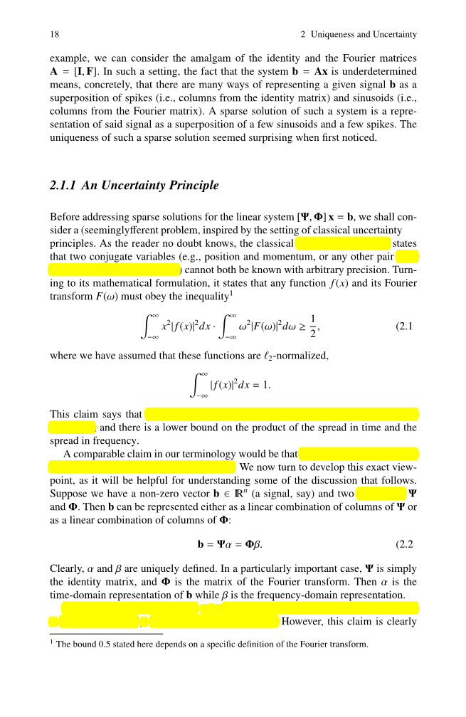 在处理线性方程组[Psi;, Phi;] x = b的稀疏性方案之前,受经典不确定性的启发,我们应当考虑一个(看似)不同的问题。正如读者无疑知道的那样,经典的不确定性原理指出,两个共轭变量(例如,位置和动量,或通过傅立叶变换耦合的任何其他对)不能都以任意精度已知。转到它的数学公式,它声明任何函数f(x)和它的傅立叶变换F(omega;)必须服从不等式