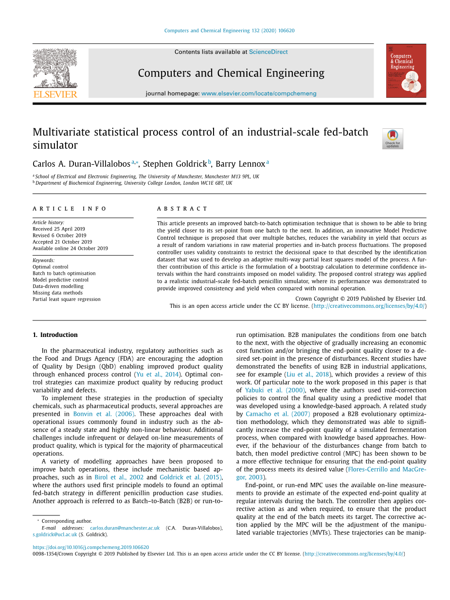 本文提出了一种改进的逐批优化技术,它能够从一批到下一批的成品率接近其设定值。此外,一个创新的预测模型控制技术是指在多个批次中,降低产量的变异性,即原材料特性随机变化和间歇过程波动的结果。提议的控制器使用有效性约束将决策空间限制在标识所描述的范围内数据集,用于开发过程的自适应多路偏最小二乘模型。本文的另一个贡献是建立了一个bootstrap计算公式,以确定在模型有效性的硬约束条件下对tervals的置信度。应用所提出的控制策略到一个实际的工业规模的补料批式青霉素模器在那里它的性能被证明与正常操作相比,提高了稠度和收率。