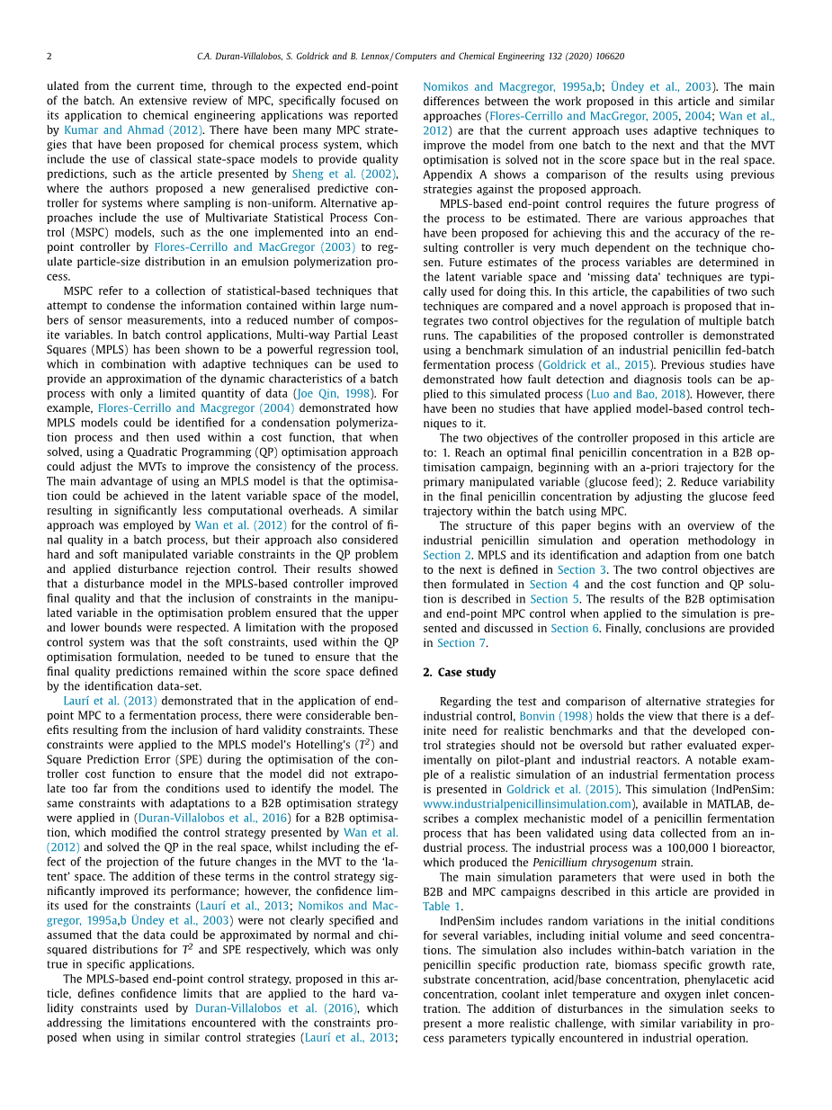 罗莉et al。(2013)的研究表明,在将末端MPC应用于发酵过程中,由于包含了硬效度约束,会产生许多的好处。在对控制器成本函数进行优化时,将这些约束应用于MPLS模型的Hotelling (T2)和Square Prediction Error (SPE),以确保模型不会与用于识别模型的条件推断得太远。B2B优化策略的适应性约束同样适用于(Duran-Villalobos等人)。, 2016)进行B2B优化,修改Wan等人提出的控制策略。(2012)解决了现实空间中的QP问题,同时包括了未来MVT变化对“la- tent”空间的投影效果。在控制策略中加入这些项显著提高了控制策略的性能;然而,用于约束的置信限(Lauri等人)。,2013;Nomikos和Macgregor, 1995a,b Undey等。假设T2和SPE的数据分别可以近似为正态分布和卡方分布,仅在具体应用中是正确的。