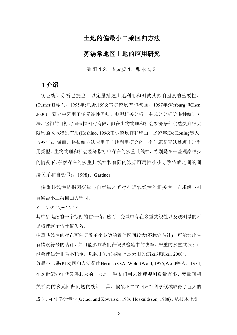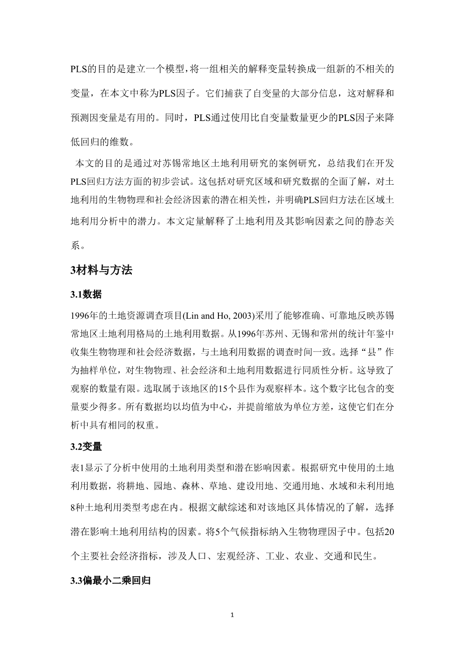 The objectives of this paper are to summarize our initial attempts to develop a PLS regressionapproach on land use research through a case study of the Suzhou-Wuxi-Changzhou region in China. These encompass efforts to gain a thorough understanding of the study area and the research data, the underlying relevance of biophysical and socio-economic factors to land use, and make clear the potential of the PLS regression approach to regional land use analysis. The paper quantifies and accounts for static relations between land use and its influencing factors.