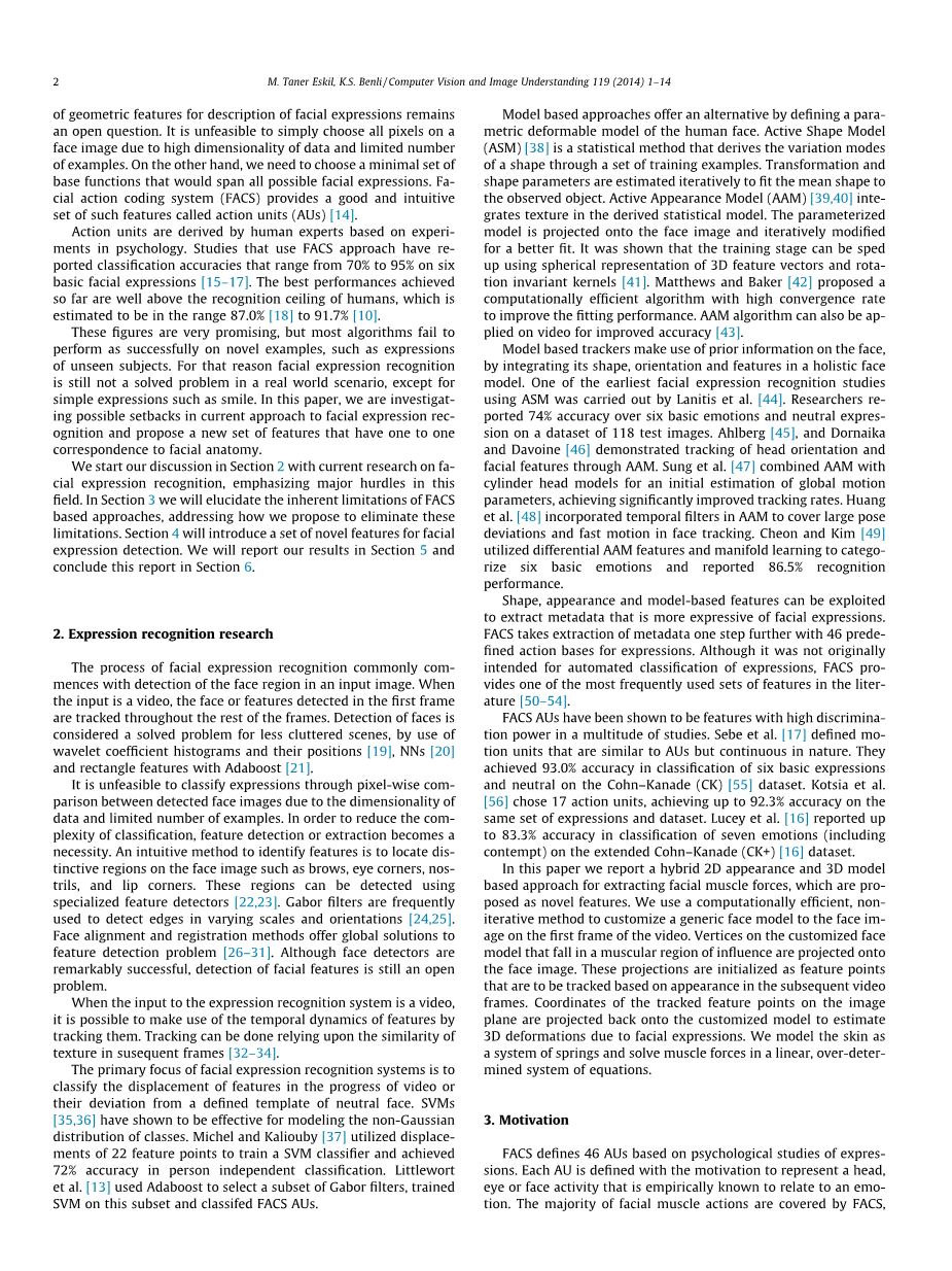 基于模型的方法提供了一个替代的定义一个参数变形模型的人脸。主动形状模型(ASM)[ 38 ]是一种统计方法,导出了一个沙的变化模式通过一组训练实例。变换和形状参数估计迭代,以适应所观察到的对象的平均形状。主动外观模型(AAM)[ 39,40 ]结合文本你得到的统计模型。将参数化的模型投影到人脸图像上,并对其进行迭代修正,以更好地适应。结果表明,训练阶段可以加快应用型数值表示的三维特征向量和旋转不变的内核[ 41 ]。马休斯和贝克[ 42 ]提出了一种计算效率高的算法,具有较高的收敛速度,以提高拟合性能。AAM算法也可应用于提高准确度[ 43 ]视频。基于模型的跟踪利用脸上的先验信息,将其形状、方向和特点在一个整体的人脸模型。最早的人脸表情识别研究使用ASM的lanitis等人进行。研究人员报告说,超过74%的精度六种基本情绪和中性对数据集的118个测试图像的自然表达。Ahlberg[ 45 ]和dornaika和davoine [ 46 ]显示跟踪头的朝向和面部特征通过AAM。Sung等人[ 47 ]结合AAM的机智有一个全局运动参数的初始估计的气缸头模型,实现显着提高跟踪率。Huang等人[ 48 ]成立时间滤波器在AAM覆盖大部分POS人脸跟踪中的偏差和快速运动。她和基姆[ 49 ]利用微分AAM特征和流形学习的六个基本的情绪分类和识别性能报告86.5%。形状,外观和基于模型的功能,可以利用提取的元数据这更表现为表情。FACS以元数据一步46个预先定义行动单元来表达。虽然它最初不是用于表达式自动分类,但是FACS提供了一种最常用的功能集在文献[ 50–54 ]中。
