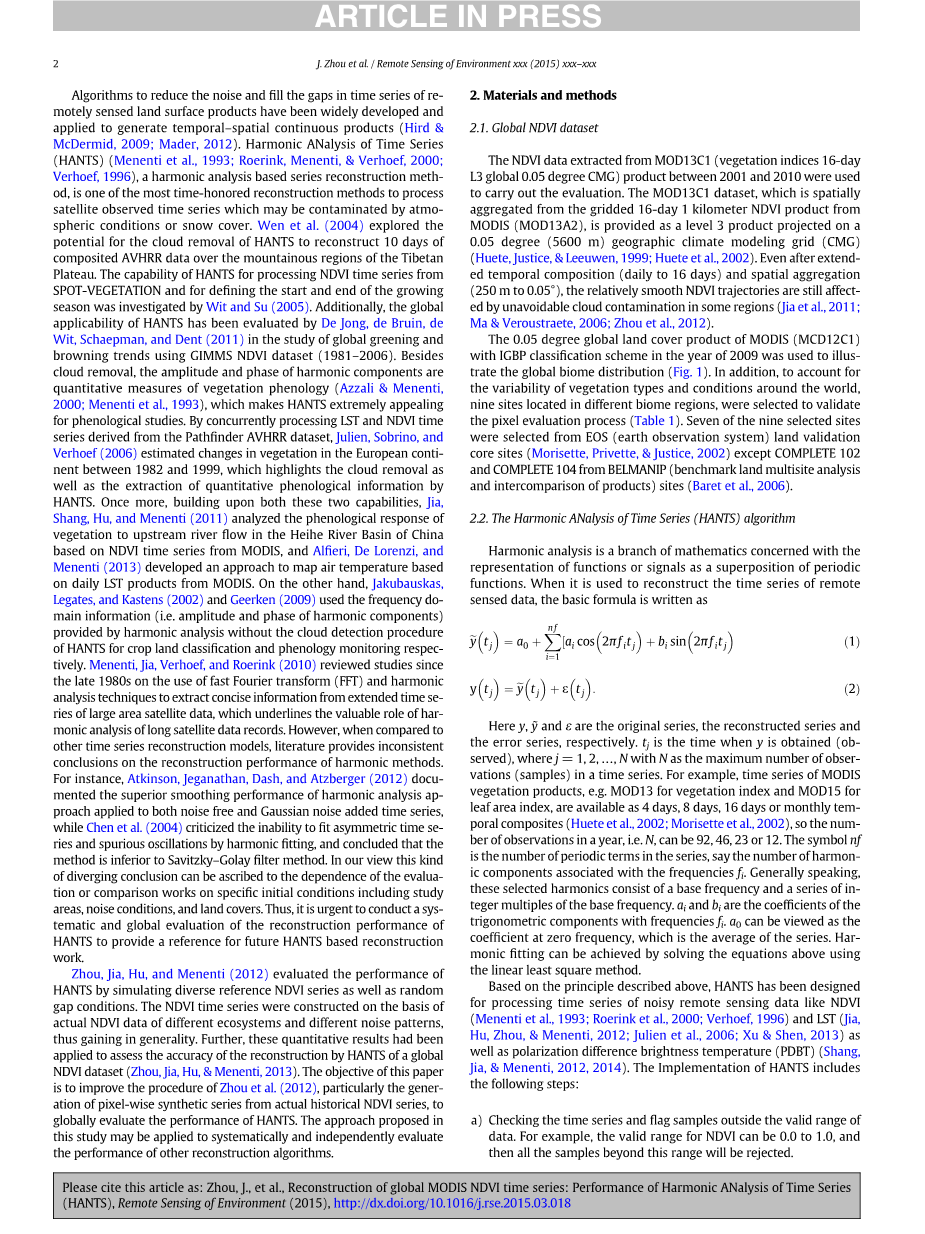 算法以减少噪音并在时间序列的遥感地表填补国内空白产品已经广泛地开发和应用于生成时空连续产品(Hird的amp;McDermid,2009;马德尔,2012)。时间序列谐波分析(HANTS)(Menanti等人,1993; Roerink,Menanti,amp;Verhoef,2000;Verhoef,1996),谐波分析基于一系列的重建方法,是最悠久的重建方法来处理一个卫星观测到可能受大气条件或积雪被污染的时间序列。 Wen等(2004)探讨了为云去除HANTS的潜在重建10天在西藏的山区合成后AVHRR数据高原。 HANTS的从加工NDVI时间序列的能力SPOT-植被和用于定义成长的开始和结束赛季被机智和苏(2005)研究。此外,全球HANTS的适用性已经被德容,德布鲁因,去评估威特,Schaepman,登特(2011)全球绿化的研究利用GIMMS NDVI数据集(1981-2006)褐变的趋势。除了云除去,谐波分量的振幅和相位植被物候(Azzaliamp;Menenti的量化措施,2000; Menenti等人,1993),这使得HANTS非常吸引人对物候的研究。通过同时处理LST和NDVI时间系列从探路者AVHRR数据来源,朱利安,Sobrino和Verhoef(2006)估计植被变化在1982年至1999年间的欧洲大陆,这凸显了云计算作为去除以及由提取的定量候信息HANTS。再次,建立对双方这两个功能,贾,会上,胡锦涛和Menenti(2011)分析了物候响应植被上游在中国黑河流域河流流量基于MODIS从和阿尔菲里,德洛仑和NDVI时间序列Menenti(2013)开发了一种方法来映射气温基于从MODIS LST日用产品。另一方面,Jakubauskas,使节和Kastens(2002)和吉尔肯(2009)中使用的频域的信息(即振幅和高次谐波成分的相位)通过谐波分析无云检测程序规定HANTS分别用于农作物的土地分类和物候监测。 Menenti,贾,Verhoef和Roerink(2010年)审查的研究,因为上世纪80年代末就利用快速傅立叶变换(FFT)和谐波分析技术来提取长时间系列大面积的卫星数据,这强调了长期卫星数据记录谐波分析的重要作用简洁的信息。然而,相对于其他时间序列的重建模式,文献提供不一致对谐波的方法重建性能的结论。例如,阿特金森,Jeganathan,短跑和Atzberger(2012年)记载应用到无噪声和高斯噪声增加的时间序列的谐波分析方法的优越表现平滑,而Chen等(2004)批评无法适应不对称的时间序列和谐波杂散拟合振荡,并得出结论:方法不如Savitzky-Golay滤波方法。在我们看来,这种发散结论可以归因于在评估或比较的依赖性的适用于特定的初始条件,包括研究区,噪声环境和土地覆盖。因此,迫切需要进行重建的性能进行了系统的全球评估HANTS提供基于未来HANTS重建的参考工作。