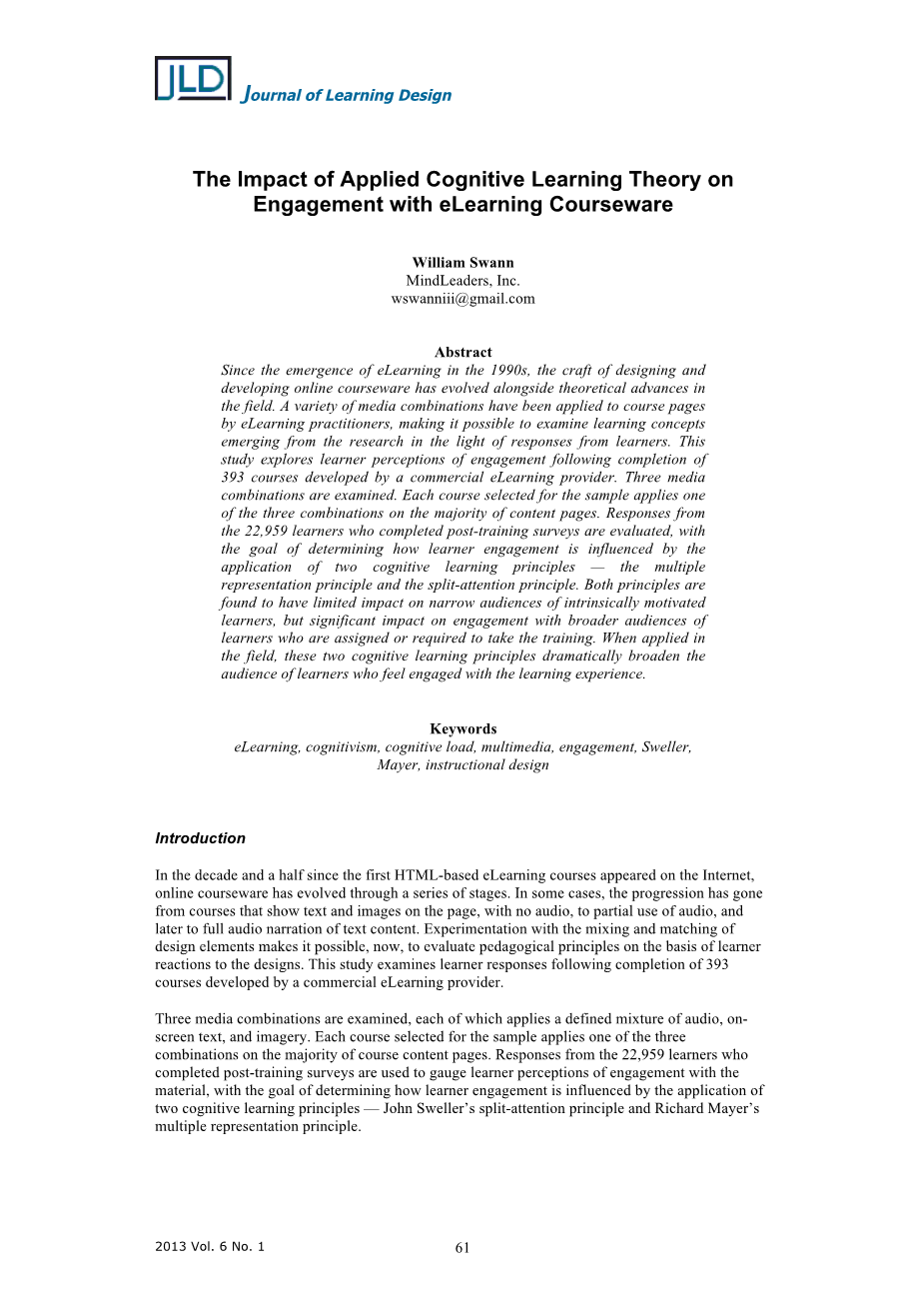 从上世纪90年代,工艺设计和开发在线课件与理论研究进入一个新的领域。多种媒体通过从业者的学习已应用于课程,从研究者的光响应使得它可以检验学习的概念。这研究完成后,根据参与学习的393课程的学习提供商业开发。每门课程选择的内容增加了到了多个组合。从22959个参与研究的学生完成培训后的调查与评价,目标确定如何学习参与的影响两认知学习原理的综合应用表示原则和分散注意力的原则。这两个原则从发现有限学习者内在动机缩小观众的影响,但显着的影响与更广泛的观众参与他被分配的学习者需要参加培训。当应用在现场,这两个认知学习的原则,学习者的学习经验,从事观众的感觉,极大地拓宽。