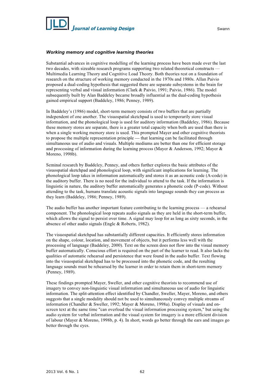 巴德利(1986)模型,短期存储器是由两个缓冲器部分彼此独立的。视觉空间画板是用来暂时储存视觉信息,和语音回路是用于听觉信息(巴德利,1986)。因为这些记忆的储存是分开的,有一个更大的总容量时,使用比有当一个工作记忆存储使用。这促使Mayer和其他认知理论提出了多重表征原则,学习可以促进通过音频和视频同步使用。多介质比和处理信息的高效存储在学习过程(Mayer amp; Anderson,1992;Mayer和莫雷诺,1998年)。