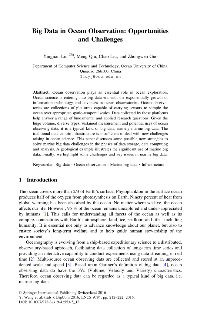 海洋观测在海洋勘探中起着至关重要的作用。 随着信息技术的指数级增长和海洋观测技术的进步,海洋科学正在进入大数据时代。海洋观测一般为基于多个平台的集合,它通过传感设备在适当的时空尺度上对海洋相关数据进行采样。这些平台收集的数据有助于回答一系列的基础和应用研究问题。由于海洋观测数据的体积巨大、类型多样、持续测量和潜在用途较大,它是一种典型的大数据,即海洋大数据。传统的以数据为中心的基础设施不足以应对海洋科学中出现的新挑战。本文讨论了在数据存储、数据计算和分析阶段解决海洋大数据挑战的一些可能的新策略。一个地质例子说明了海洋大数据的重要应用。最后,我们强调了海洋大数据中的一些挑战和关键问题。