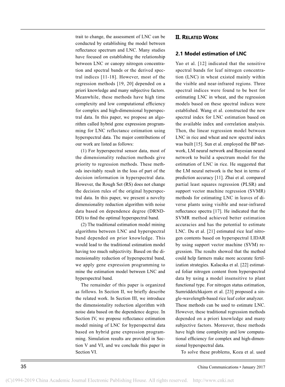 基于高光谱传感器数据的模型挖掘是数据处理的一个重要分支。从高维、复杂的高光谱传感器数据中提取有用的知识对于传感器数据在广泛行业中的应用至关重要[1-10]。传统的基于高光谱传感器数据的模型挖掘方法是现场采样和实验室确定。然而,该方法在采样、测量和数据分析方面容易出错,而且耗时。在许多基于高光谱传感器数据的模型挖掘应用中,叶氮浓度的反射率估计模型挖掘是最重要的。由于液氮的变化可能影响叶片内部组织的生理特性,引起特定的反射光谱。随着特性的改变,可以通过建立反射光谱与LNC之间的模型来进行LNC的评价。许多研究集中在确定液氮或冠层氮浓度与光谱带或衍生光谱指数之间的关系[11-18]。然而,大多数回归方法[19,20]依赖于先验知识和许多主观因素。同时,这些方法对于复杂和高维的高光谱数据具有较高的时间复杂度和较低的计算效率。本文提出了一种基于高光谱数据的LNC反射率估计的混合基因表达编程算法。本文工作的主要贡献如下:(1)对于高光谱传感器数据,大部分降维方法优先于回归方法。这些方法不可避免地导致高光谱数据中部分决策信息的丢失。然而,粗糙集并没有改变原始高光谱数据的决策规则。本文提出了一种新的基于依赖度的噪声数据降维算法,用于寻找最佳的高光谱波段。(2)传统的LNC与高光谱波段之间的估计模型挖掘算法依赖于先验知识。这将导致传统的评估模型具有太多的主观性。在高光谱波段降维的基础上,应用基因表达编程方法,建立了高光谱波段与低光谱波段之间的估计模型。本文的其余部分组织如下。在第二节中,我们简要介绍了相关的工作。第三节介绍了基于依赖度的噪声数据降维算法。在第四节中,我们提出了基于混合基因表达编程的高光谱数据反射率估计模型挖掘。第五节和第六节给出了仿真结果,并在第六节中对本文进行了总结。