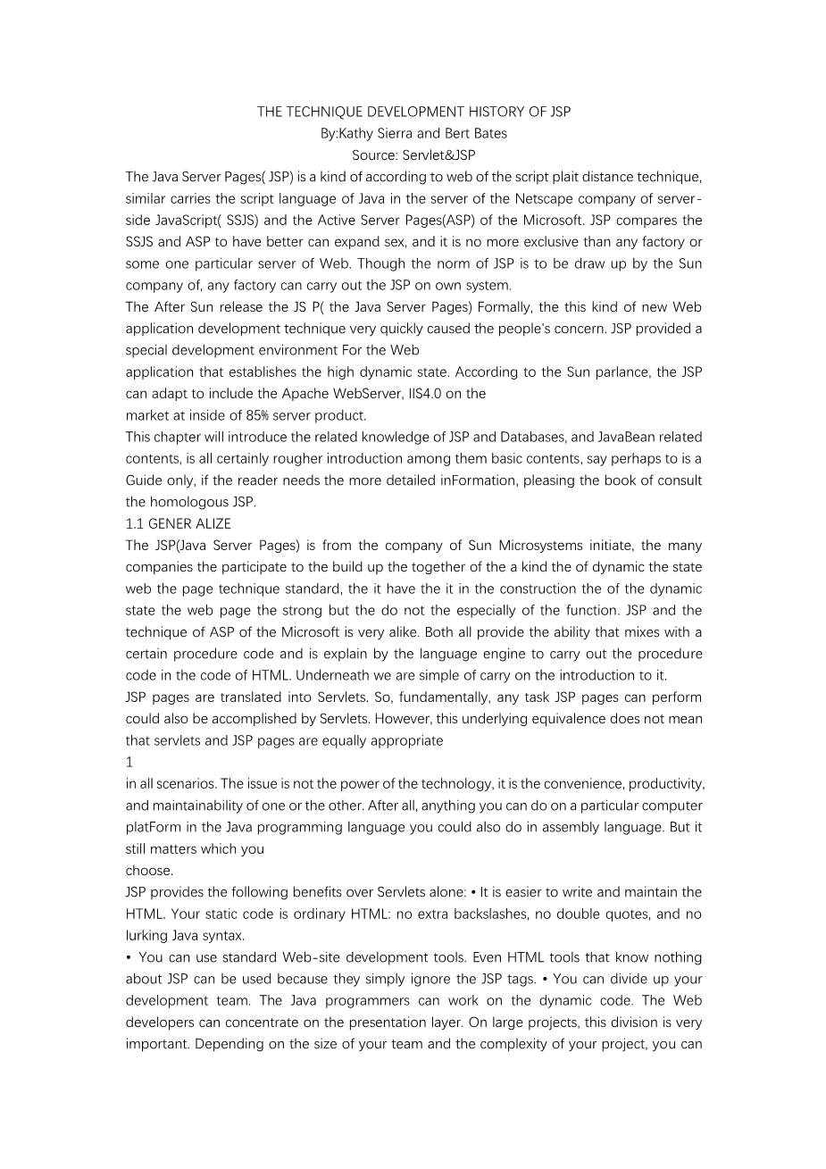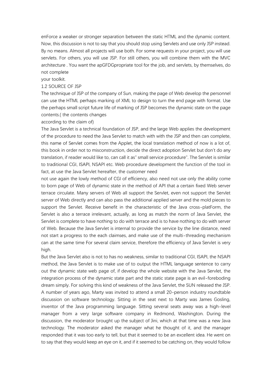 但Java Servle t也不是没有缺点,和传统的CGI、ISAPI、NSAPI方式相同, Java Servlet是利用输出HTML语句来实现动态网页的,如果用Java Servlet 来开发整个网站,动态部分和静态页面的整合过程会非常难以实现。为了解决Java Servlet的这种缺点,SUN推出了JSP。