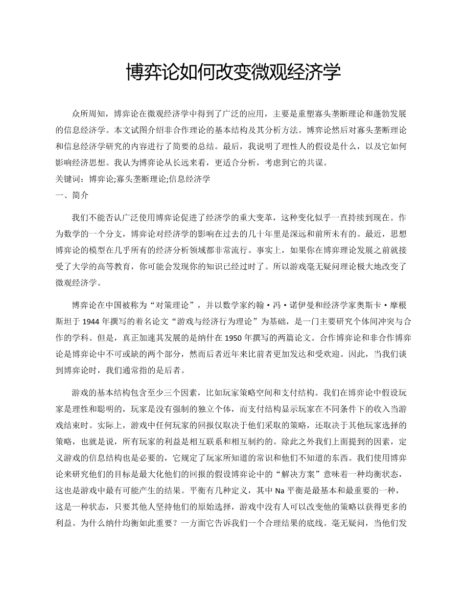 We can not deny that the extensive use game theory has boosted a significant change in economics which appears to continue until now.As a branch of mathematics,what influence game theory had on economics is profound and unprecedented in last few decades.Recently,the thoughts and models of game theory has been very popular in almost every field of economic analysis.In fact,if you received high education in university before game theory has its day,you may find your knowledge out of date.So there is no doubt that game theory has changed microeconomics greatly.