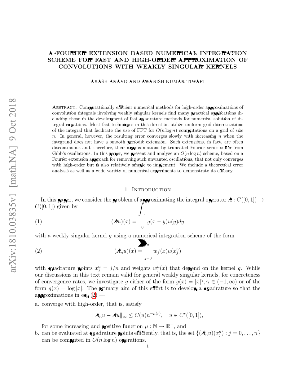 这份文件的组织如下。在第二节中,我们描述了光滑函数的Fourier扩张的构造,其中函数数据在等距网格上可用。下一个,在第三节,我们给出了卷积A近似的数值积分格式,然后在第四节对我们的积分格式进行了理论分析。在第5条中, 给出了数值积分格式中奇异矩的数值计算。此外,作为特例,我们还讨论了我们的紧支点数值积分格式。 第6款中的职能。第七节给出了验证本文所实现的正交精度的各种数值结果。