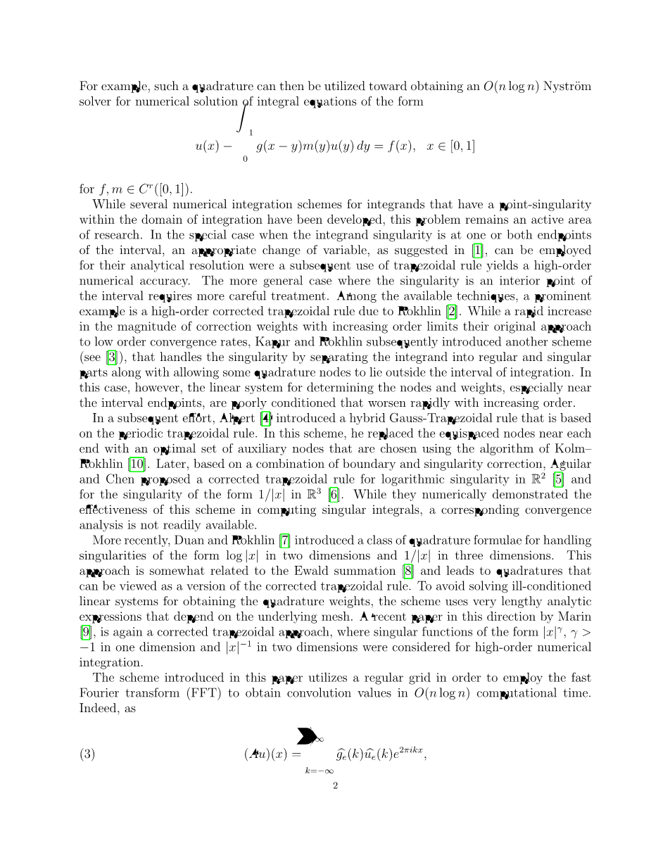 虽然有几种具有点奇点的被积函数的数值积分方案在整合领域内已经开发出来,这个问题仍然是一个活跃的研究领域。在特殊情况下,当被积函数处于区间的一个或两个端点时,变量的适当变化,如[1], 可以用于他们的解析分辨率,随后使用梯形法则产生高阶数值精度。奇点是区间内点的更一般情况需要更仔细的处理。在可用的技术中,一个突出的例子是由于Rokhlin导致的高阶校正梯形法则[2]. 虽然随着订单增加而修正权重的迅速增加限制了他们对低阶收敛率的原始方法,但Kapur和Rokhlin随后引入了另一种方案(见[3]), 通过将被积函数分成规则和奇异部分以及允许一些正交节点位于积分区间之外来处理奇点。然而,在这种情况下,用于确定节点和权重的线性系统,特别是在间隔端点附近,线性系统的调节很差,随着顺序的增加而迅速恶化。在随后的努力中,Alpert[4] 引入了基于周期梯形法则的混合高斯梯形法则。在这个方案中,他用一组最佳辅助节点替换每端附近的等空间节点,这些节点是使Kolm-Rokhlin算法选择的[10]. 后来,基于边界和奇点校正的组合,Aguilar和Chen提出了 中对数奇点的校正梯形法则[5] 并且对于R中的1 / |x|形式的奇点 [6]. 虽然他们在数值上证明了该方案在计算奇异积分中的有效性,但是相应的收敛分析并不容易获得。