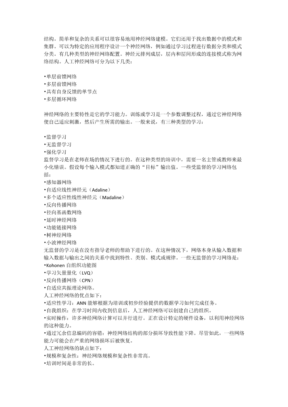 An Artificial Neural Network (ANN)[7] , usually known as a neural network, is basically a mathematical model motivated by biological nervous systems like brain processes information. A neural network comprises an interconnected group of simulated neurons and it uses connectionist approach to process information for computation. Neural network works like an adaptive system, which changes its structure in learning phase. Simple and complex relationships can be easily modeled using neural networks. They are also used to find out patterns and clusters in data. An ANN can be designed for a particular application, such as data classification and pattern categorization through a learning process. There are several types of neural network configurations. The arrangement of neurons to form layers and the connection pattern formed within and between layers is called the network structures. An ANN can be classified into following categories: