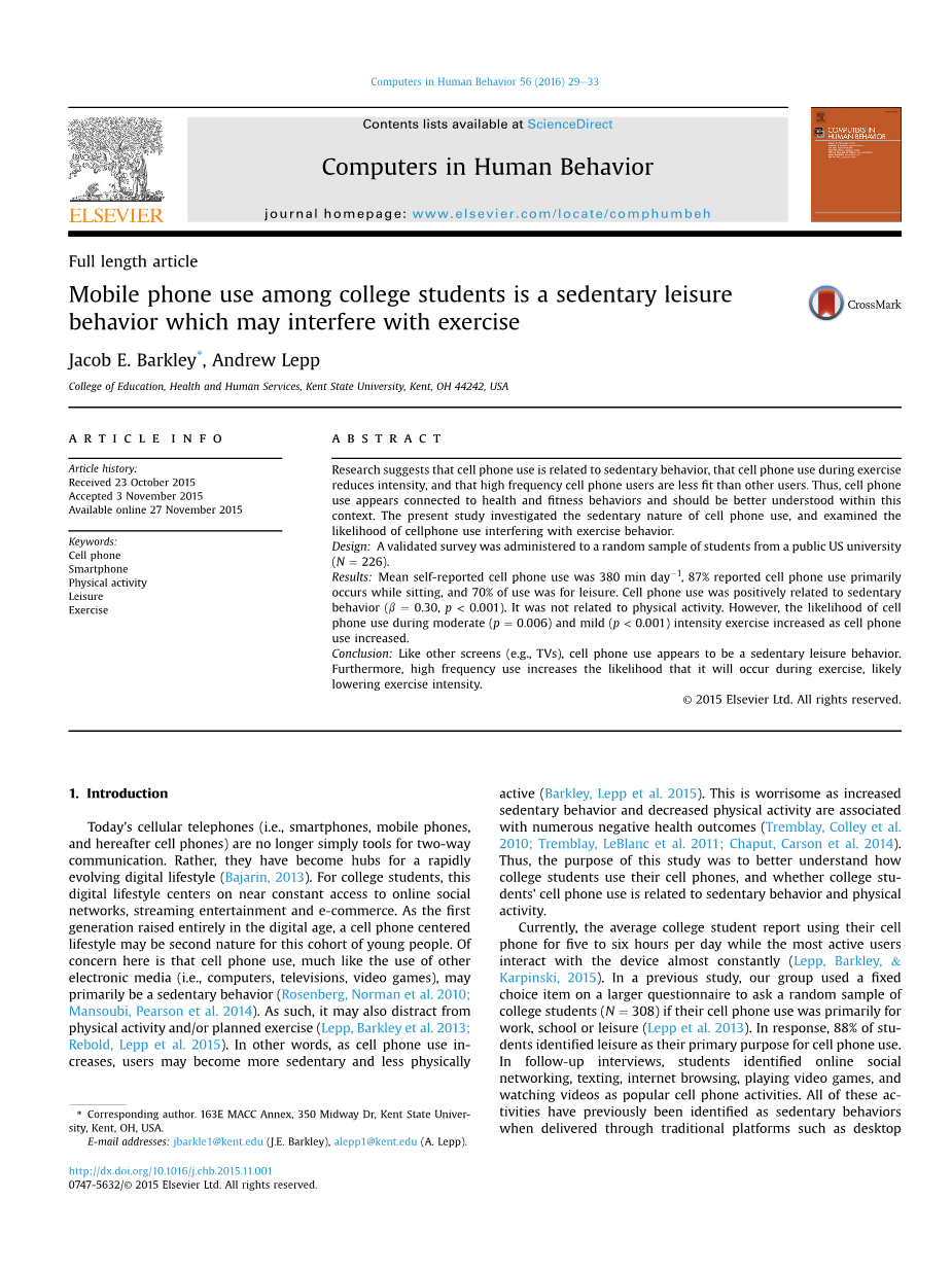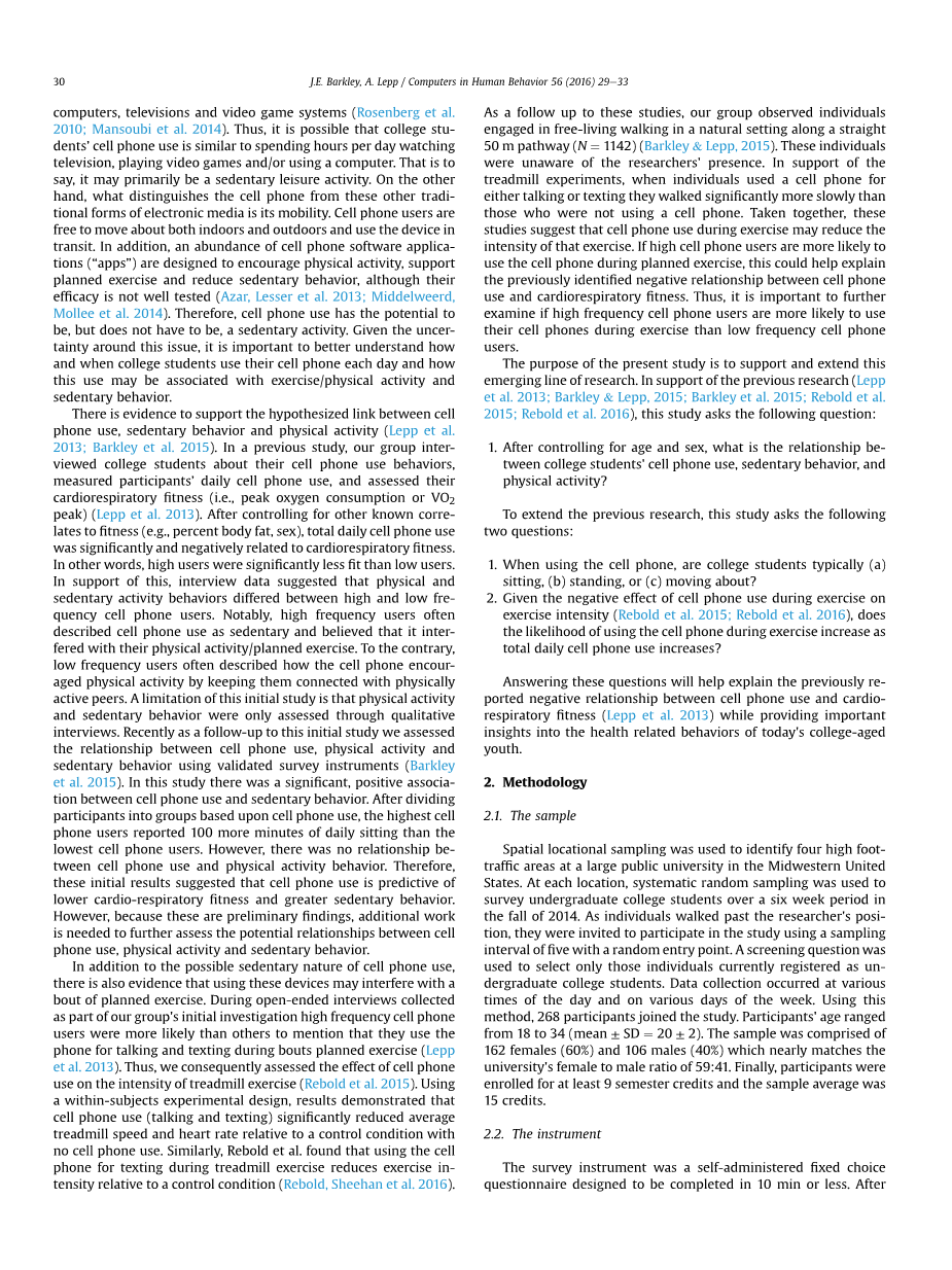 如今的蜂窝电话(即智能手机,移动电话和以后的手机)不再仅仅是双向沟通的工具。相反,它们已经成为快速发展的数字生活方式的枢纽(Bajarin,2013)。对于大学生来说,这种数字生活方式主要依赖于在线社交网络,流媒体娱乐和电子商务。由于第一代年轻人完全在数字时代长大,以手机为中心的生活方式可能是这群年轻人的第二天性。值得关注的是,使用手机就像使用其他电子媒体(即电脑,电视,视频游戏)一样,可能主要是久坐不动的行为(Rosenberg, Norman et al. 2010;Mansoubi, Pearson et al. 2014)。因此,使用手机也可能分散身体活动和有计划的运动(Lepp, Barkley et al. 2013;Rebold, Lepp et al. 2015)。 换句话说,随着手机使用量的增加,用户可能会坐得更久,而且身体活动也会减少(Barkley, Lepp et al. 2015)。这种情况是令人担忧的,因为增加的久坐行为和减少的身体活动与许多负面的健康结果相关(Tremblay, Colley et al.2010; Tremblay, LeBlanc et al. 2011; Chaput, Carson et al. 2014)。因此,这项研究的目的是为了更好地了解大学生如何使用他们的手机,以及大学生使用手机是否与久坐行为和身体活动有关。