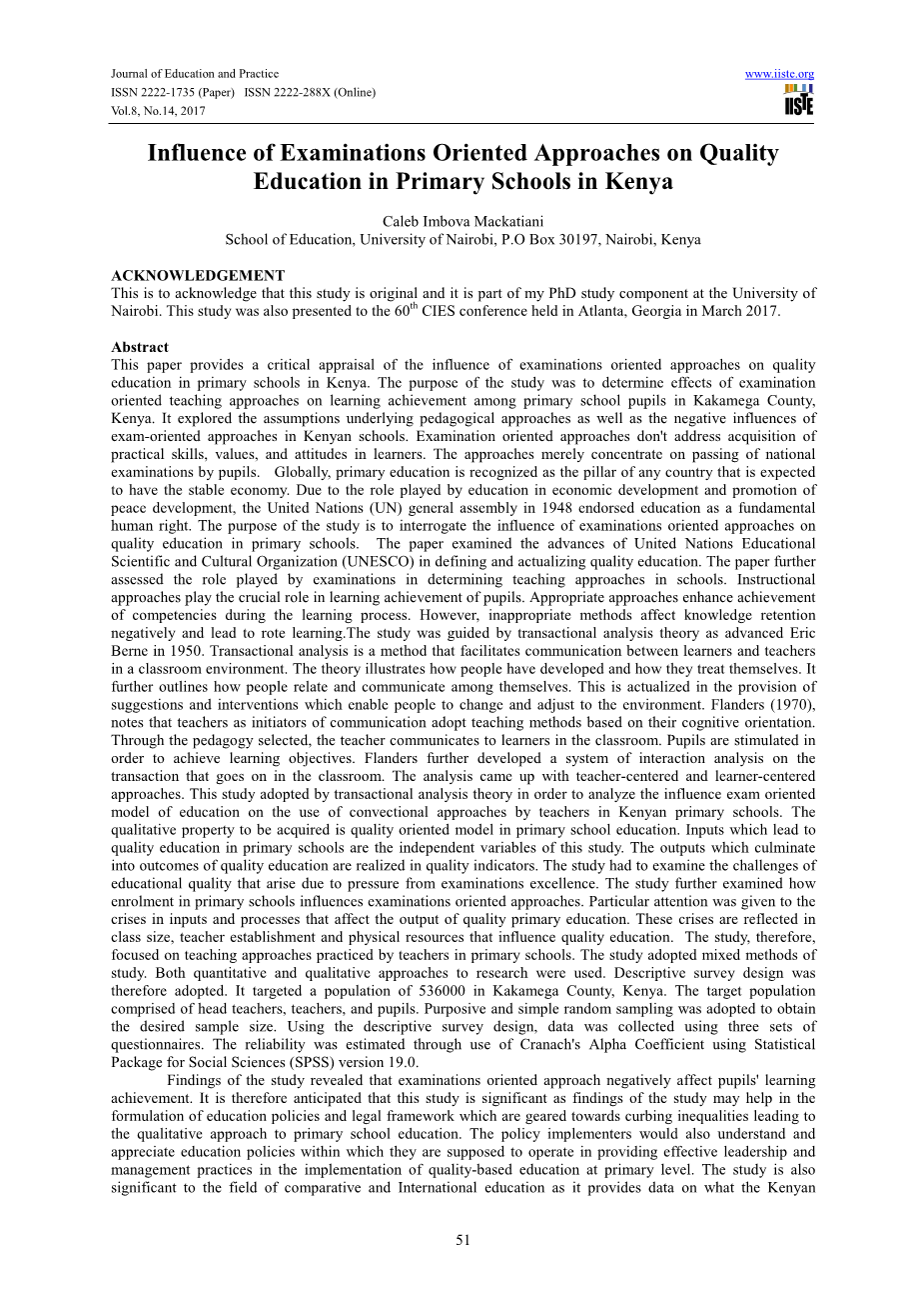 本文对肯尼亚面向考试的方法对小学素质教育的影响进行了重要评估。本文的研究目的是确定应试教学方法对肯尼亚卡卡梅加县的小学生学习成绩的影响。它探讨了对教学方法的假设以及肯尼亚学校应试教育的消极影响。应试方法不涉及学习者实际技能、价值观和态度的获取,这些方法仅仅关注学生通过国家考试。在全球范围内,小学教育被认为是任何一个经济稳定的国家的支柱。由于教育在经济发展和促进和平发展中发挥的作用,1948年联合国大会将教育视为一项基本人权。本研究旨在探讨应试教育对小学素质教育的影响,探讨了联合国教育科学文化组织在确定和实施素质教育方面的进展。本文进一步评估了考试在确定学校教学方法中所起的作用。教学方法对小学生学习成绩起着至关重要的作用,适宜的方法在学习过程中能实现达到能力要求。然而,不适宜的方法会消极地影响知识的保持并导致死记硬背的机械学习。该研究以1950年Eric Berne的交流分析理论为指导,交流分析是促进学习者和教师在课堂环境中交流的一种方法,这一理论说明了人们是如何发展和如何对待自己的,它进一步说明人们如何相互联系和交流,而这是在提供建议和干预措施并使人们能够改变和适应环境的情况下实现的。Flanders(1970)指出,教师作为沟通的发起者要采用基于他们认知取向的教学方法,通过选择的教学法,教师要与课堂上的学习者进行交流,为了达到学习目标学生会受到刺激。Flanders进一步开发了一个关于教室内交易的交互分析系统,该分析提出了以教师为中心和以学习者为中心的方法。本研究采用交流分析理论来分析肯尼亚小学教师使用对流式教育的影响考试导向模式,要获得的质量属性是小学教育中以素质为导向的模式。导致小学素质教育的投入是本研究的独立变量,以质量指标实现以高质量教育成果为高质量的产出。该研究必须考察由于卓越考试带来的压力而导致的教育质量所面临的挑战,并进一步研究了小学招生如何影响面向考试的方法,尤其对影响优质小学教育产出的投入和过程中的危机给予了特别关注。这些危机反映在影响素质教育的班级规模,教师队伍建设和物质资源上,因此这项研究侧重于小学教师的教学方法。该研究采用混合研究方法,使用定量和定性的研究方法,所以采用了描述性调查设计。它针对肯尼亚卡卡梅加县536000人口,目标人群由校长、教师和学生组成,并采用目的和简单的随机抽样来获得所需的样本量。该研究先使用描述性调查设计,再使用三组问卷收集数据,再通过使用Cranach的Alpha系数并基于使用社会科学统计软件包(SPSS)19.0版估计可靠性。