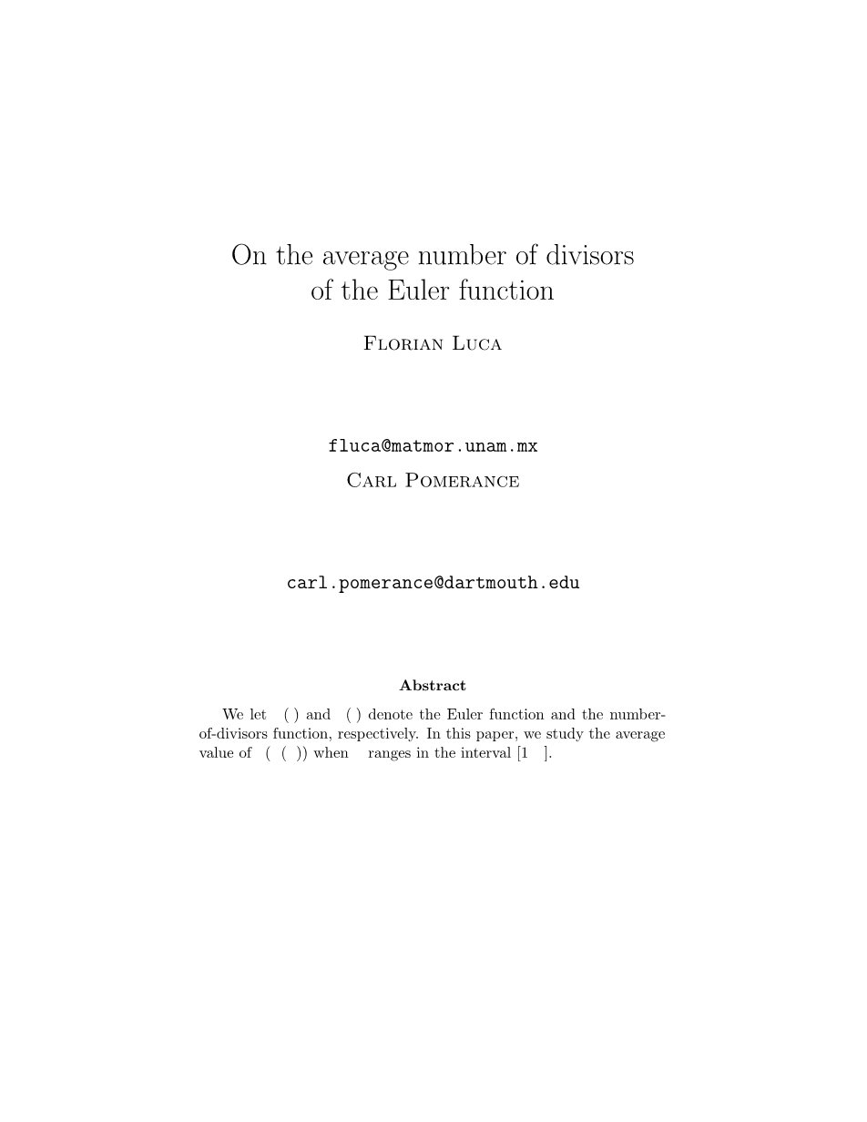 对于正整数n,设^(N)表示n的欧拉函数,设T(N),u(N)和0(N)表示n的除数,n的素数和素幂divi的个数。 分别为n个变量。有许多论文讨论了^(N)的算术性质,其中许多是受到1935年鄂尔多斯[5]开创性论文的启发。特别是在[7]中 (另见[6]),考虑了^(N)的素因子的正规数。自Hardy和Ramanujan以来,u(N)(或0(N))的正常值为log log n,而自Erdos和Kac t则知道。 HAT(/(N)-log log n)/\/log log n的/=to或0的高斯分布。在