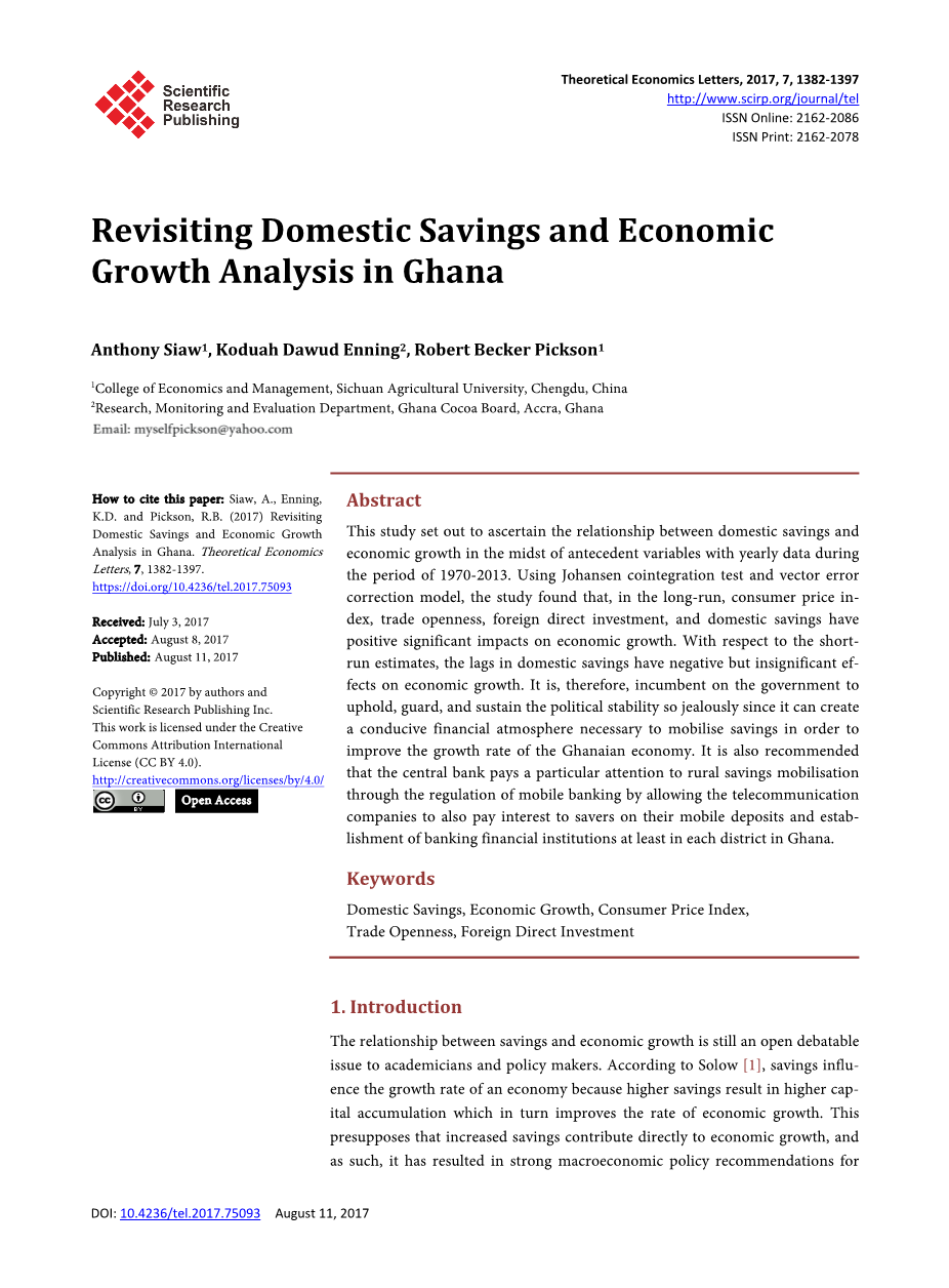 储蓄与经济增长的关系,仍是学术界和政策制定者面临的一个公开的争论问题。根据Solow [1]的观点,储蓄影响经济的增长率,因为较高的储蓄导致较高的资本积累,进而提高经济增长率。这就预设了储蓄的增加直接促进经济增长,并由此许多国家产生了对增长和发展的强有力的宏观经济政策建议。宏观经济政策的基本目标之一是实现可持续的经济增长。因此,经济增长与其他宏观经济因素之间的联系对于确定引导经济增长的政策具有重要意义。Deaton[2]认为因果关系不仅对于理解过程是必要的,对于策略的设计也是必要的。他支持储蓄是经济增长和经济稳定的重要决定因素的观点。从理论上讲,有关经济增长与储蓄之间关系的研究,最早来源于Harrod [ 3 ]和Domar [ 4 ]的增长模型,该模型认为经济增长取决于储蓄水平,因此,储蓄的增加会导致经济增长率的上升。然而,在Solow [ 1 ]和Swan [ 5 ]所领导的新古典增长模型中,储蓄变动只在短期内影响经济增长,直到产出达到稳定状态。此外,根据内生增长理论,Romer[6]、Lucas[7]和Rebelo[8]指出,储蓄的增加可以触发经济增长的永久性增长。尽管经济理论认为储蓄是影响经济增长的主要因素之一,但关于储蓄与经济增长关系的实证研究却得出了褒贬不一的结论。Carroll- Weil假说( Carroll and Weil,[ 9 ] )宣称,是经济增长促进了储蓄,而不是储蓄促进经济增长。Jappelli and Pagano[10]、Sinha and Sinha[11]、Rodrik[12]、Agrawal[13]、Carroll[14]等人、Anoruo and Ahmad[15]、Verma[16]、Abu[17]等人的实证研究结果与Carroll和Weil[9]相似。相反,其他实证研究如Lewis[18]、Levine和Renelt[19]、Mankiw等人[20]、Alguacil等人[21]、Sajid和Sarfraz[22]支持资本原教旨主义者,他们相信储蓄会导致经济增长。Shahbaz和Khan[23]以经验来支持资本原教旨主义者,他们提出因果关系的方向是从储蓄到经济增长。他们指出,通过储蓄积累的资本将积极转化为投资,从而在长期内实现可持续的经济增长。然而,这一假设受到了Ogoe[24]和Pickson[25]等人的质疑,他们明确表示没有证据表明储蓄和经济增长之间存在长期关系。事实上,对加纳储蓄与经济增长关系的实证研究是有限的,也不具有扩张性。Ogoe[24]和Pick- son[25]等人通过检验储蓄与经济增长之间的二元协整和格兰杰因果关系,普遍关注经济增长对国内储蓄总量变化的响应程度。作者没有发现长期均衡关系存在的证据,但在短期内,国内储蓄和经济增长分别存在双向和单向的因果关系。这些研究并没有真正的关注储蓄率下降和其他增长驱动变量对加纳经济增长的影响,同时铭记储蓄和其他增长驱动变量在国家经济增长和发展中的作用。因此,本研究与其他文献研究的不同之处在于,主要是利用Johansen协整检验和矢量误差修正模型,引入居民消费价格指数、贸易开放程度、外国直接投资等前因变量,来确定储蓄与经济增长之间的长期或短期关系是否会发生变化。鉴于此,本文的结构如下:第二节考虑了相关文献的回顾,第三节考虑计量经济学方法,第四节是关于实证结果和分析,而第五节侧重于结论和政策含义。