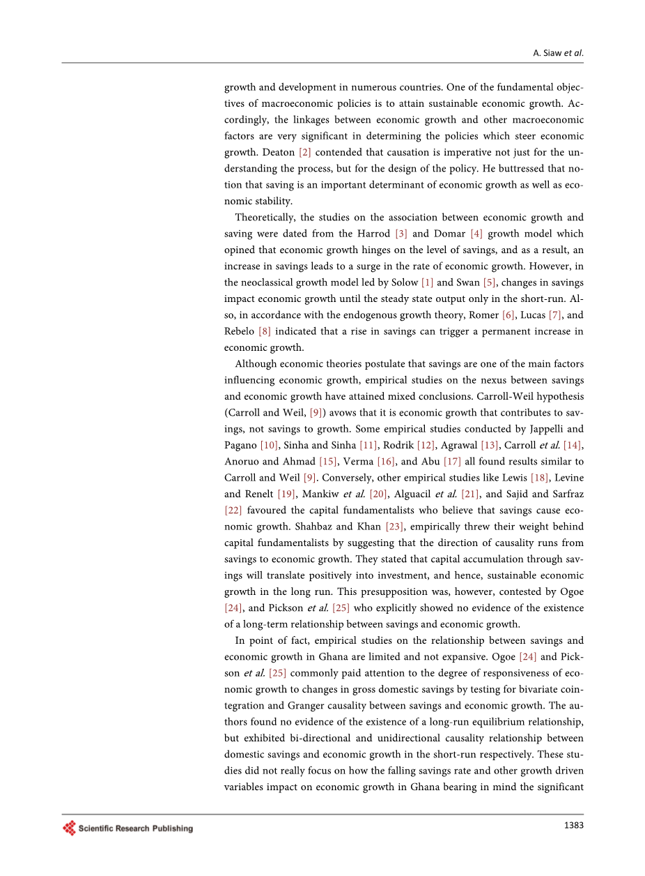 长期以来,经济增长是否取决于储蓄水平的问题一直是理论界和实证界争论的焦点。支持这一假设的人认为,储蓄影响一个经济体的增长率,因为更高的储蓄会导致更高的资本积累,而资本积累反过来又会提高经济增长率(Harrod,[3]; Domar, [4]; Lewis, [18]; Solow, [1]; Romer, [6]; Lucas, [7]; Rebelo, [8]; Levine and Renelt, [19]; Mankiw ., [20]等人;和 Deaton, [2]).。此外,Alguacil等人[21],Sajid和Sarfraz[22],以及Shahbaz和Khan[23]都认为储蓄的增加可以触发经济增长率的提高。然而,卡罗尔-韦尔假说(Carroll and Weil,[9])宣称,促进储蓄的是经济增长,而不是储蓄促进经济增长。其他相关实证文献如Jappelli和Pagano(1994[10])、Sinha和Sinha[11]、Rodrik[12]、Agrawal[13]、Carroll等人[14]、Anoruo和Ahmad[15]、Verma[16]、Abu[17]都报道了经济增长对储蓄的巨大贡献。关于Misztal [26], Ijeoma [27]等人, Sothan[28]则认为储蓄和经济增长是相互独立的。 此外,Ogoe[24]、Pick- son[25]等人没有发现储蓄与经济增长之间的长期关系,而Anoruo and Ahmad[15]、Shahbaz and Khan[23]、Abu[17]、El-Seoud[29]等实证研究都建立了储蓄与经济增长之间的长期关系。虽然储蓄与经济增长之间的关系在经济文献中已被广泛讨论和研究,但不同的国家也有不同的储蓄效应,因此得出了不确定的结论。Verma[16]利用1951-2004年的数据,采用自回归分布滞后(ARDL)边界检验技术,分析了印度国内储蓄、国内投资和经济增长之间的长期关系。结果表明,除经济增长为因变量外,国内储蓄总额、国内投资总额与经济增长之间存在长期关系。研究还表明,储蓄并不促进增长,但增长导致储蓄,储蓄在短期和长期都驱动投资,投资是印度经济增长的驱动力。