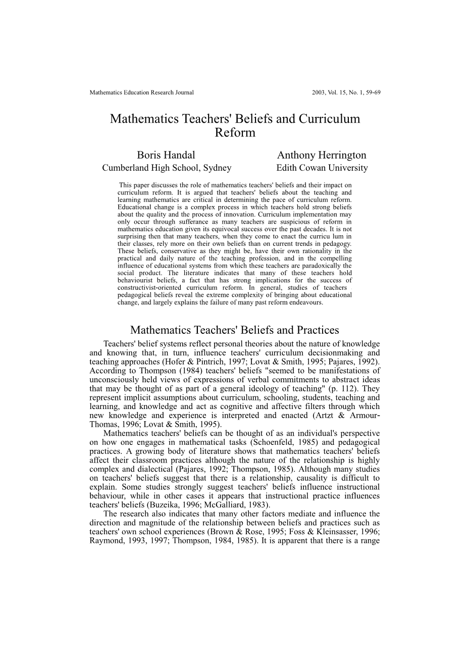 数学教师的信念在将课程指南转化为课堂教学的复杂和日常现实中起着促进或抑制的作用(Haynes,1996;Jackson,1968,1986;Koehleramp;Grouws,1992;Sosniak,Ethingtonamp;Varelas,1991)。如果教师持有与创新相一致的信念,那么接受就更有可能发生。然而,如果教师在制定课程时持有相反的信念或认识到障碍,那么低收入、稀释和腐败的改革很可能随之而来(Burkhardt,Fraser,amp;Ridgway,1990)。Prawat(1990)确认,教师可以是变革的载体,也可以是变革的障碍。无论人们对他们支持改革的期望有多高,他们的观点总是有可能与支持改革的观点不一致,因此成为这一努力的主要障碍。Hart(1992)补充说,当教师认为新的任务是琐碎和肤浅的,他们往往不信任其他创新。