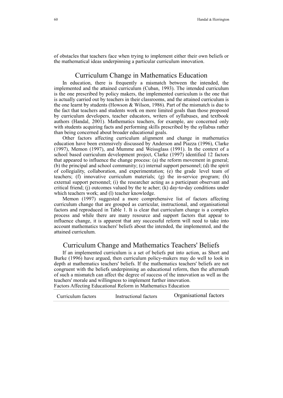 Memon(1997)提出了一个更全面的影响课程改革的因素列表,这些因素分为课程因素、教学因素和组织因素,并在表1中重现。很明显,课程改革是一个复杂的过程,虽然有许多资源和支持因素似乎会影响课程改革,但任何成功的改革显然都需要考虑数学教师对课程目标、实施和实现的信念。