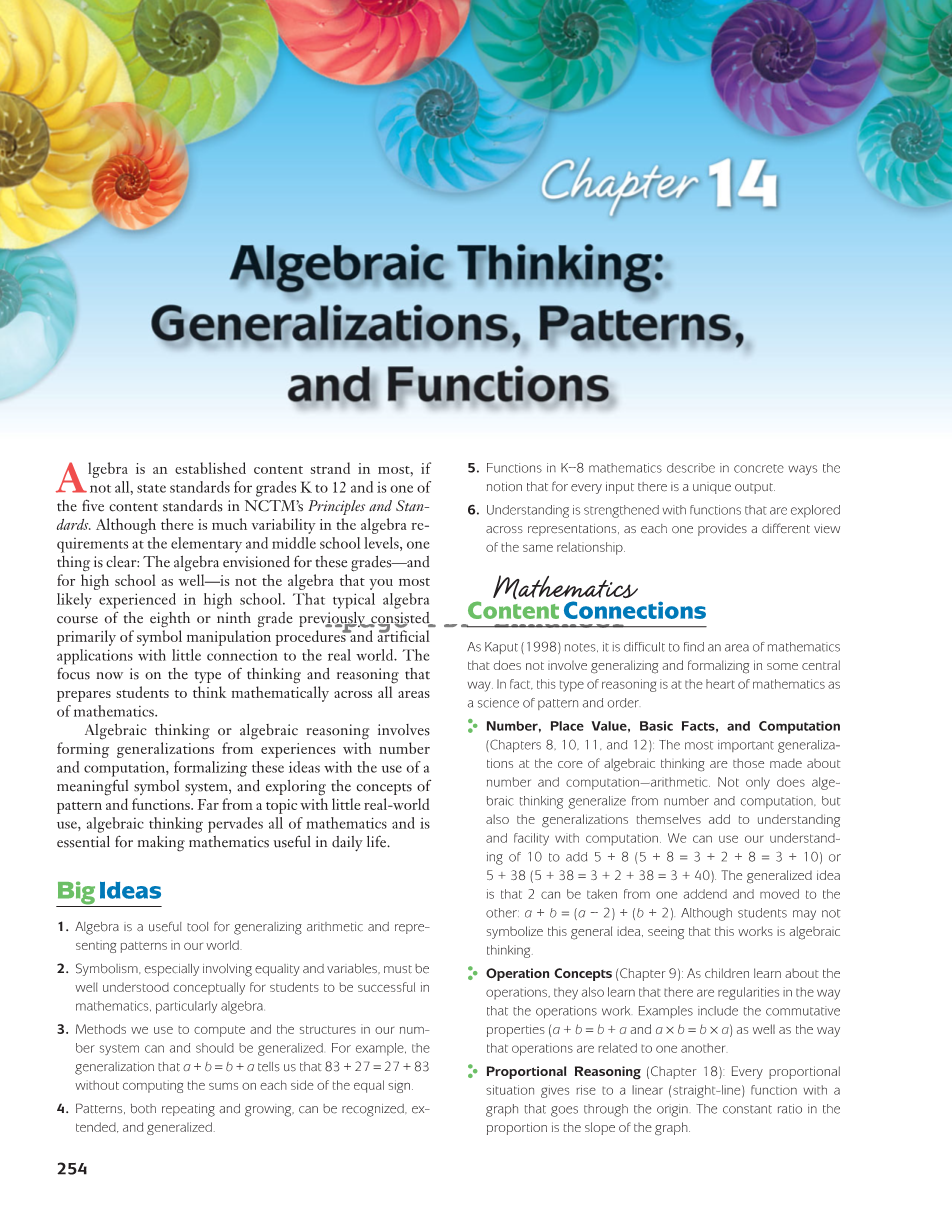 算术从幼儿园就开始了,并随着学生学习数字和计算的各个方面,包括运算的基本事实和意义而继续。因此,代数思维与第9章到第13章的思想有很大的联系。