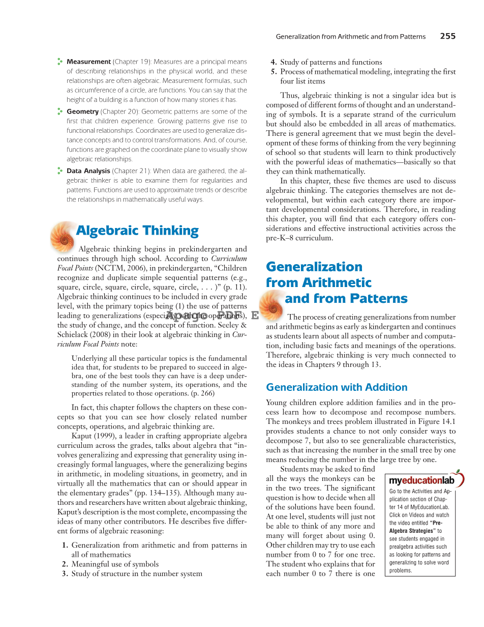 在本章中,这五个主题被用来讨论代数思考。这些范畴本身并不是发展的,但在每一个范畴内都有重要的发展考虑。因此,在阅读这一章的时候,你会发现每个类别都提供了在学前教育8年课程中需要考虑的问题和有效的教学活动。