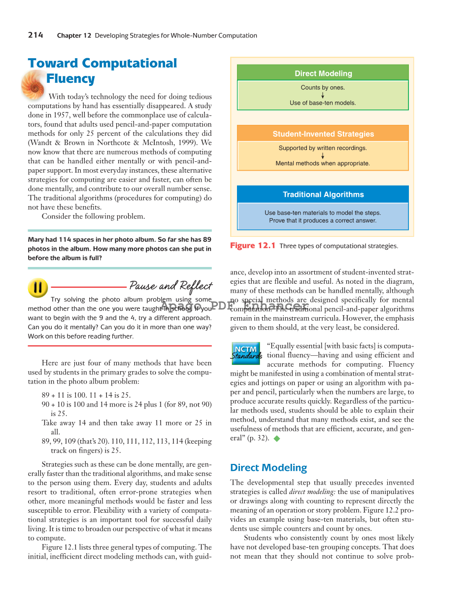通常,在发明策略之前的发展步骤被称作直接建模:使用操纵或绘图以及计算来直接表示运算或者story问题的方法。图12.2提供了一种使用基数10材料的例子,但通常情况下学生会使用简单的计数器并按1计数。