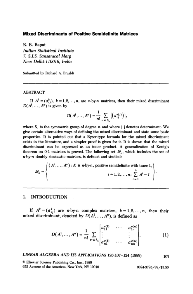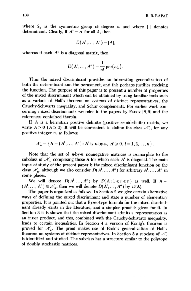 本文的结构如下。在第2节中,我们提供了定义混合行列式并陈述许多基本属性的某些替代方法。需要指出的是,混合行列式的Ryser型公式已经存在,并给出了更简单的证明。在第3节中,表明混合行列式将一个表示作为内积,并与柯西施瓦茨不等式相结合,得到了一个确定的不等式。在第4节中,证明了Konig 定理的一个版本。该证明利用了拉多对不同代表系统的霍尔定理的推广。在第5节中,对的一个子类进行了识别和研究。这个子类的结构类似于双随机矩阵的多面体。