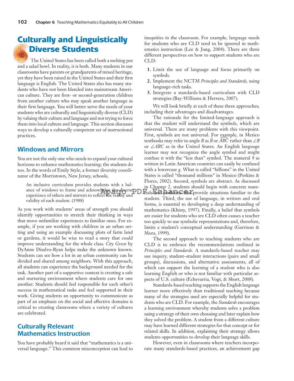 你可能听说过“数学是一门通用语言”。这种常见的误解会导致课堂上的不公平。例如,在数学教学中,CLD学生的语言需求往往被忽视(Leeamp;Jung,2004)。关于如何帮助CLD学生,有三种不同的观点: