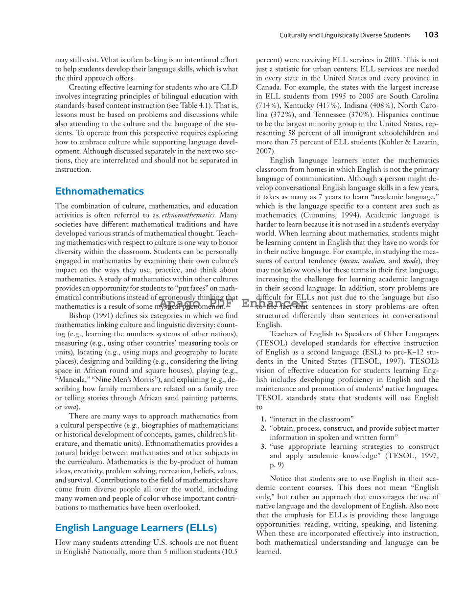 英语学习者从英语不是主要交际语言的家庭进入数学课堂。虽然一个人可能会在几年内发展英语会话技能,但学习“学术语言”需要7年的时间,这是一种特定于数学等内容领域的语言(Cummins,1994年)。学术语言更难学,因为它不在学生的日常生活中使用。当学生学习数学时,他们可能正在学习英语的内容,而这些内容在他们的母语中是没有词汇可言的。例如,在研究中心倾向(平均值、中位数和模式)的测量时,他们可能不知道第一语言中这些术语的单词,这增加了第二语言学习学术语言的挑战。此外,故事问题对于英语学习者来说是困难的,这不仅是因为语言本身,还因为故事问题中的句子结构往往不同于英语会话中的句子。