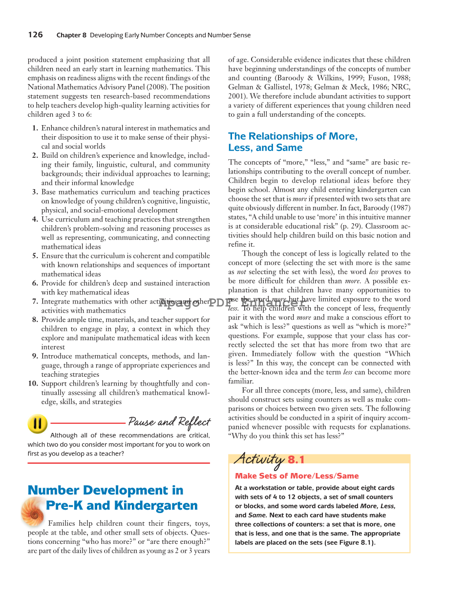 2002年,NCTM和国际青少年教育联合会(NAEYC)发表了一份联合立场声明,强调所有儿童都需要尽早开始学习数学。这种对准备就绪的强调与国家数学咨询小组(2008年)最近的研究结果一致。这份立场声明提出了十项基于研究的建议,以帮助教师为3至6岁儿童开展高质量的学习活动: