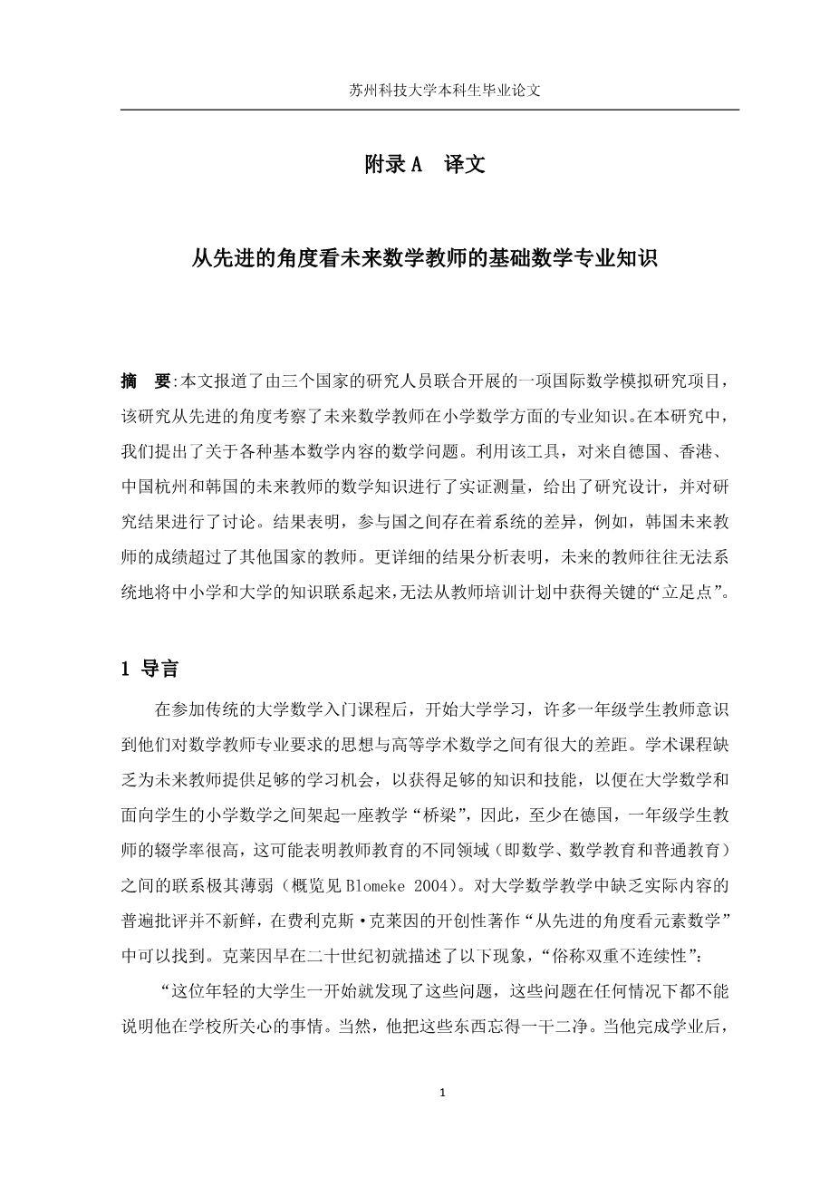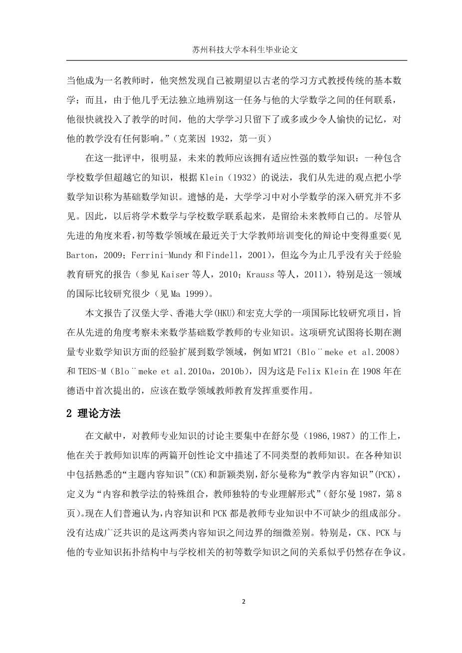 In the literature, the discussion on professional knowledge of teachers has been mainly focused on the work of Shulman (1986, 1987), who delineated different kinds of teacher knowledge in two seminal papers on the knowledge base of teachers. Among the various kinds of knowledge were the familiar category of “subject matter content knowledge”(CK) and a novel category, which Shulman termed “pedagogical content knowledge”(PCK) and defined as “that special amalgam of content and pedagogy that is uniquely the province of teachers, their own special form of professional understanding”(Shulman 1987, p. 8). It has now been widely acknowledged that both content knowledge and PCK are indispensable components of a teacherrsquo;s professional knowledge. What has not reached wide agreement is the nuance of the boundary between the two categories of content knowledge. In particular, the relations among CK, PCK and knowledge of school-relevant elementary mathematics within Shulmanrsquo;s t