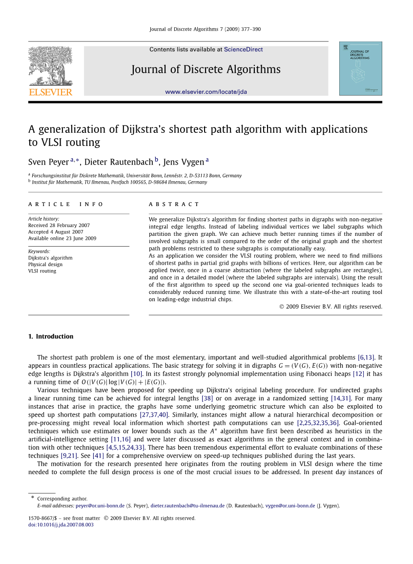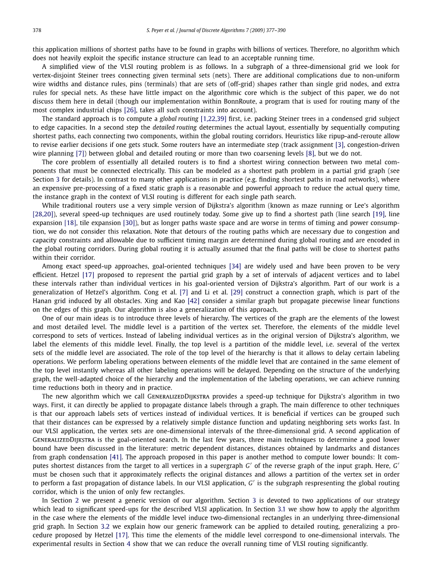 我们推广了Dijkstra算法,用于在具有非负整数边长度的有向图中找到最短路径。我们不是标记单个顶点,而是标记分割给定图形的子图。如果涉及的子图的数量与原始图的顺序相比较小,那么我们可以实现更好的运行时间,并且限制在这些子图中的最短路径问题在计算上是容易的。作为一个应用程序,我们考虑VLSI路由问题,我们需要在具有数十亿个顶点的部分网格图中找到数百万个最短路径。在这里,我们的算法可以应用两次,一次在粗抽象中(其中标记的子图是矩形),一次在详细模型中(其中标记的子图是间隔)。使用第一种算法的结果通过面向目标的技术加速第二种算法可以大大缩短运行时间。我们使用最先进的工业芯片上的最先进的布线工具来说明这一点。