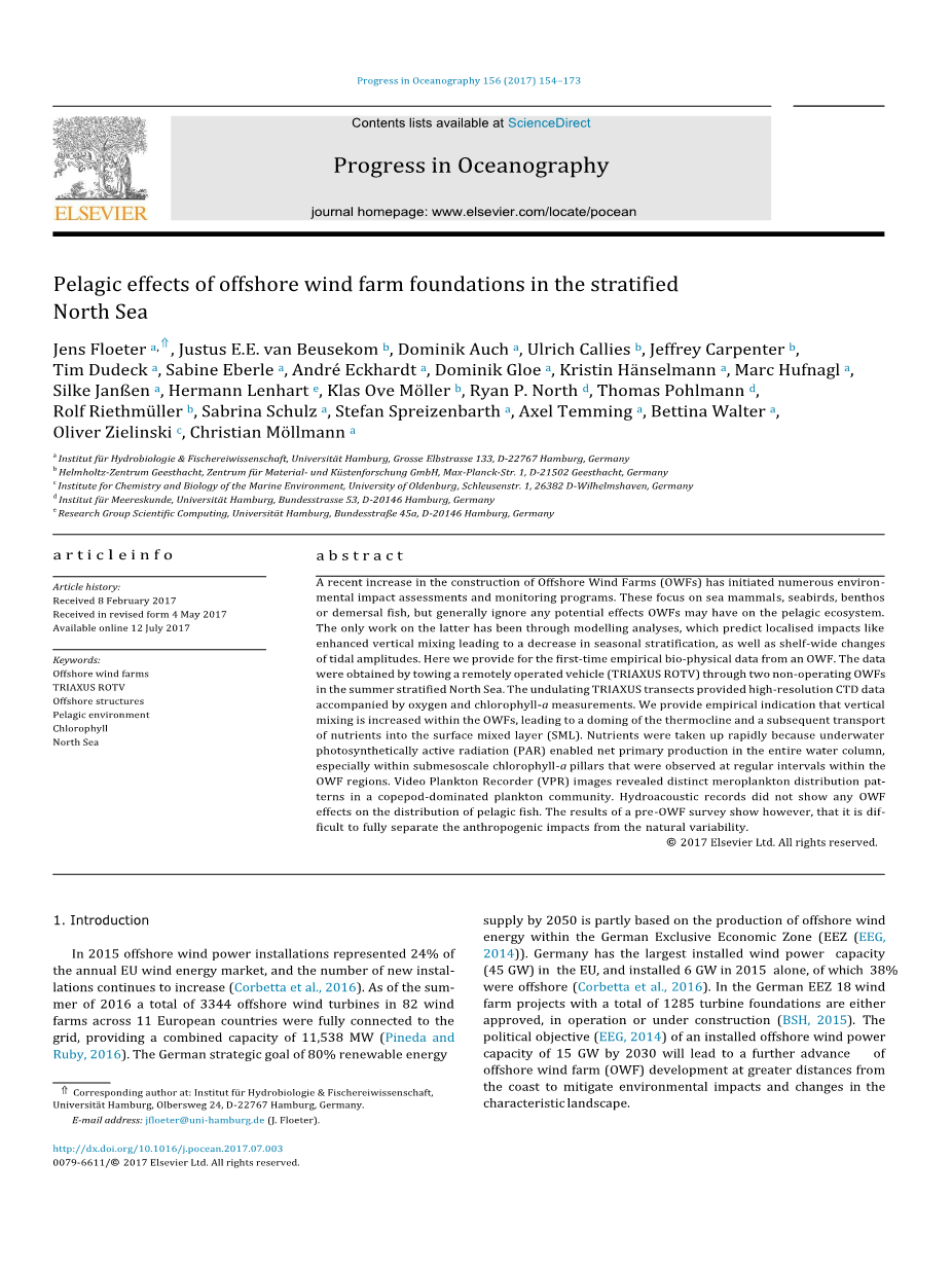 Lass et al. (2008) 测量了波罗的海河口水流中桩下游的增强混合。而模拟的Paskyabi et al. (2012)有一个OWF大小的漩涡,Lass et al. (2008) 观察到增强的混合和涡旋与单桩的特征直径和对应于vonKaacute;rmaacute;n涡街的频率(see also Grashorn and Stanev, 2016).Rennau et al. (2012) 应用数值模型来评估密集底流中的单桩诱导混合,代表波罗的海西部。他们计算了一个区域内额外的垂直整合正浮力产量10个单桩直径。然而,由于真实的风电场分布导致的结构引起的混合的影响相当低,底部水盐度的典型降低在0.1-0.3的范围内。最近,Cazenave et al. (2016)应用3D非结构化网格模型(FVCOM),仅关注涡轮单桩的物理存在的影响。在混合或分层东爱尔兰海,2011年1月和5月在潮汐流状况下明确描述了来自7个OWF的242个风力涡轮机单桩的影响。随着距离单桩的距离,空间分辨率从2.5米增加到10千米。在1km的半径内发现水平最大电流速度降低5%,即单桩直径的约250倍。发现单桩在半径仅200米范围内增加局部垂直混合,但发现OWF在2011年5月对分层产生5-15%的影响,影响面积比其162个单桩的足迹大约80,000倍。相反,Carpenter et al. (2016)得出的结论是,预计OWF对北海目前的大规模分层影响很小。他们的研究使用了混合和平流时间尺度的数量级估计,并将水体与OWF的结果与自然分层变化进行了比较。但是,如果发展继续如预期那样,OWF的影响可能在OWF规模和北海南部规模上变得显着。由此结束克拉克等人。(2014)关于OWF对远洋生态系统的生物物理影响的观测研究仍然缺失,但它们对验证模型结果是必要的。因此,我们提供了在夏季分层期间对北海两个OWF进行生物物理调查的第一个实证结果。作为以往理论和模型研究的后续,该调查的主要目标是提供潜在的OWF基础效应的初步经验指示: