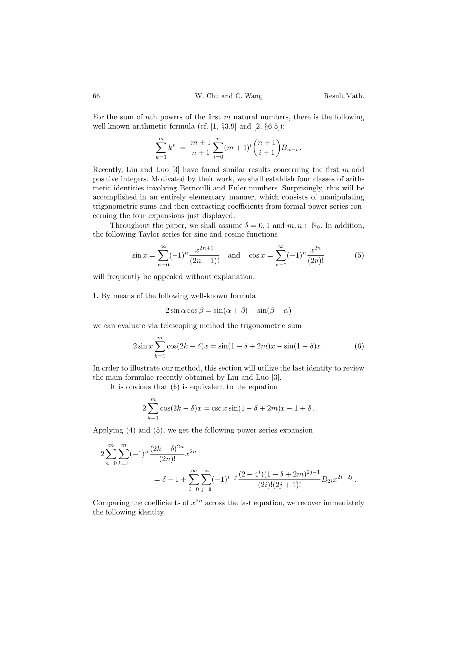 最近,Liu和Luo在第一个m正奇数整数上发现了相似的结果,在他们的工作激励下,我们将建立四类包括伯努利和欧拉数的算数恒等式.令人惊讶的是,这将是以一种完全基本的方式完成,它包括在四个展开式的基础上利用三角函数和从幂级数中提取系数.在整个论文中,我们将假定,1; .此外,文中将频繁使用下面的和函数的泰勒级数