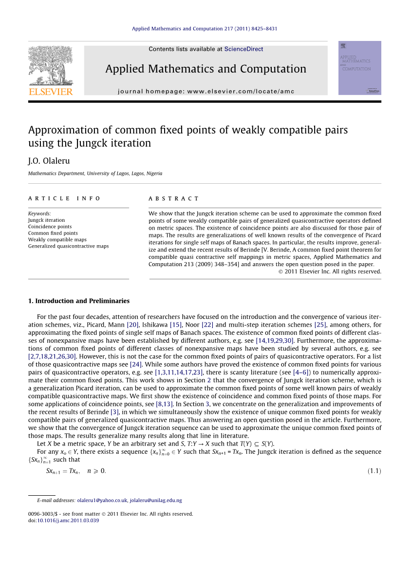 在过去的40年间,学者的注意力集中在研究各种用于逼近定义在Banach空间中的单一自映射的不动点的迭代格式,即Picard,Mann[20],Ishikawa[15],Noor[22]和多步骤迭代方案[25]。不同种类的非扩张性映射的公共不动点的存在性已经被不同的学者所证实。像[14,19,29,30].不仅如此,对于不同种类的非扩张性映射的公共不动点的逼近已经被不同的学者所研究,详见[2,7,18,21,26,30].然而,这并不是拟压缩算子对的公共不动点的案例。那些拟压缩映射详见[24].尽管一些学者已经证明了不同种类的拟压缩算子对的公共不动点的存在性,例如[1,3,11,14,17,23],很少有文献(详见[4-6])用数学方式逼近公共不动点。这项工作将在本文第二部分Jungck迭代格式收敛中详述。这其实是一个广义Picard迭代,能被用来逼近一些众所周知的弱相容拟压缩映射的公共不动点。我们首先展示重合点和这些映射的公共不动点的存在性。一些重合点的应用见[8,13].在第三部分,我们专注于对最近Berinde结果[3]的改进和推广。同时我们展示了广义拟压缩映射弱相容对的唯一公共不动点的存在性。因此回答了文章中曾提及的问题。而且,我们展示了Juncck迭代的收敛性能被用来逼近那些映射的唯一公共不动点。结论扩展了文献中的一系列结果。
