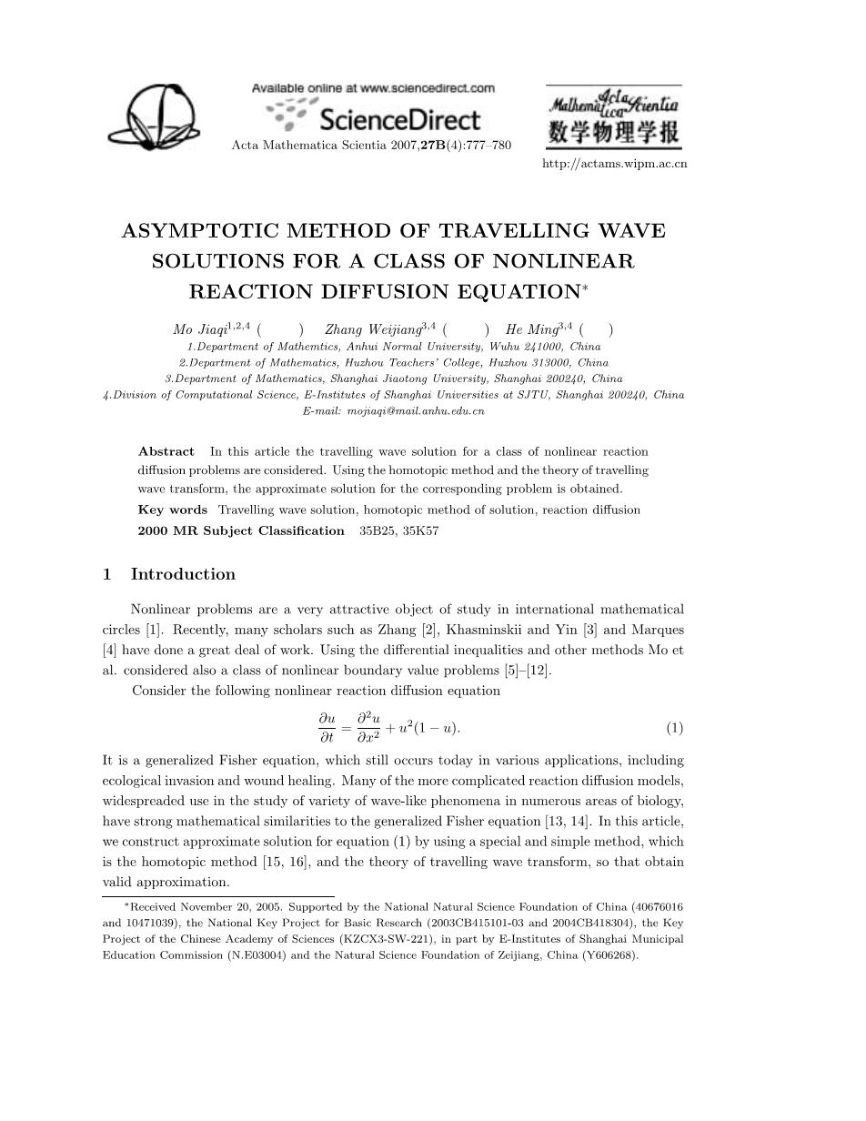 7、Mo Jiaqi. A class of nonlinear singularly perturbed problems for reaction diffusion equations. Acta Math Sci, 2003, 23B(3): 377–385