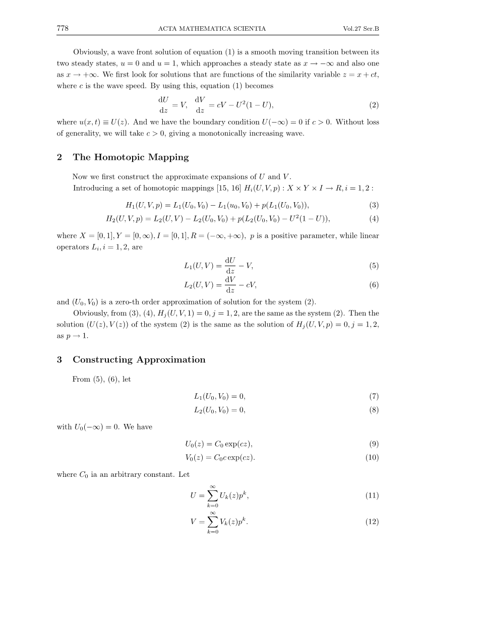 它是一个广义的费希尔方程,至今仍在各种应用中出现,包括生态入侵和伤口愈合。许多更复杂的反应扩散模型,广泛应用于研究生物许多领域中的各种类波现象,与广义费希尔方程有很强的数学相似性[13,14]。在本文中,我们用一种特殊而简单的方法构造了方程(1)的近似解,就是同伦方法[15,16]和行波变换理论,从而得出有效近似。