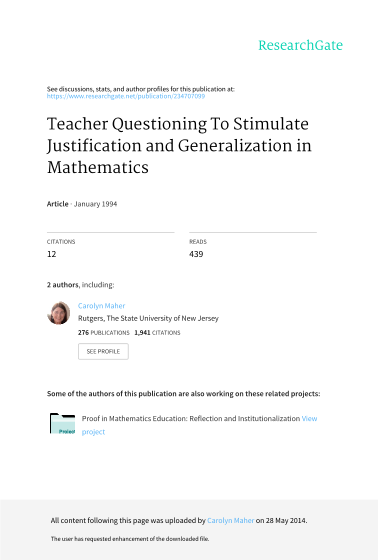 随着教师对学生思维知识的不断增长和发展,它为教师提供了一个及时提出问题的框架,以促进学生思维的认知发展。(Maher,1988; Maher,1998a,b;Maher, Martino,amp; Alston,1993; National Council of Teachers of Mathematics, 1991).对学生思维的熟练提问可以为教师提供学生发展数学思想的基本知识,这些知识可能是无法获得的。提问的艺术可能需要数年的时间来发展,因为它需要对数学和儿童的数学学习都有深入的知识。一旦获得,老师就有了一个强有力的工具来支持学生建立数学思想。在小学数学课堂上进行的国际和跨文化研究,研究教师问题对学生概念知识支持的增长的影响。我们认为教师在学生数学思维的发展中起着至关重要的作用。(Klinzing, Klinzing-Eurich, amp; Tisher, 1985; Sullivan amp; Clarke,1992;Perry,Vanderstoep,amp; Yu,1993)所有这些研究的结论是,针对概念知识和问题解决策略提出更多的开放式问题,有助于学生们有建构更复杂的数学知识。我们的工作特别研究教师提问的模式,促进学生的理由和概括,然后追踪这些问题如何激发学生的学习成绩。概念知识的掌握。