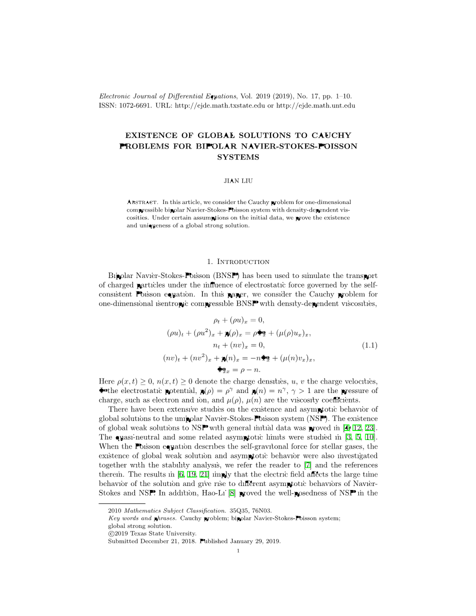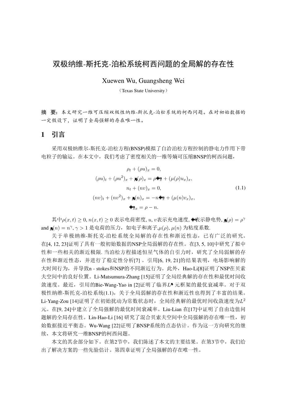 双极纳维斯托克泊松系统柯西问题的全局解的存在性外文翻译资料